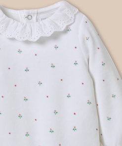 Un dors-bien en velours doux, délicatement parsemé de petites fleurs colorées. Le col en broderie anglaise ajoute une touche de charme rétro. Un parfait cadeau de naissance.