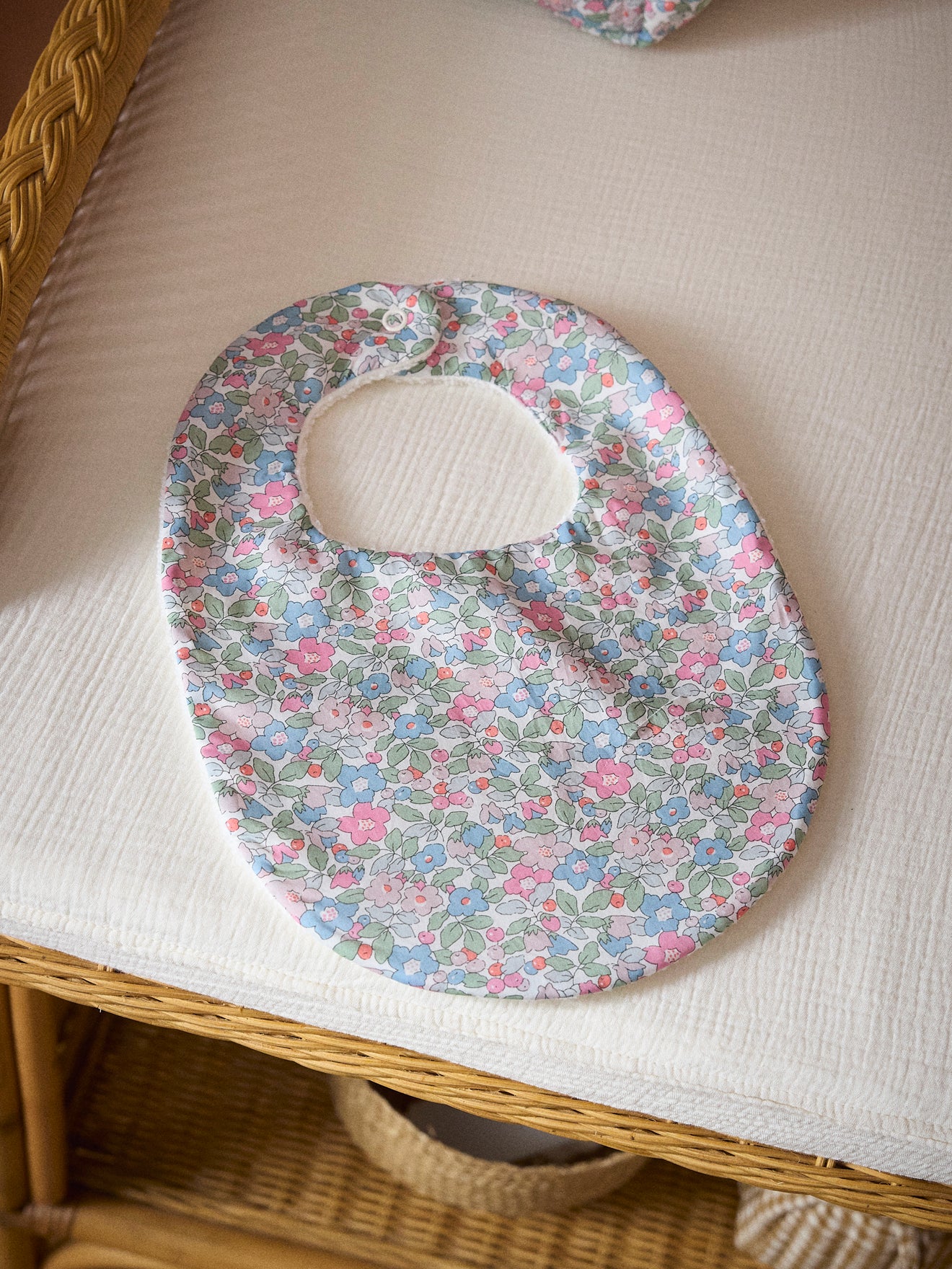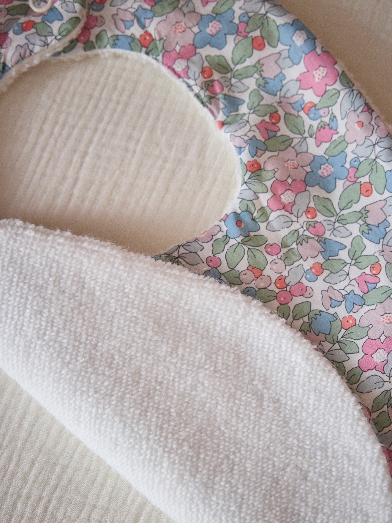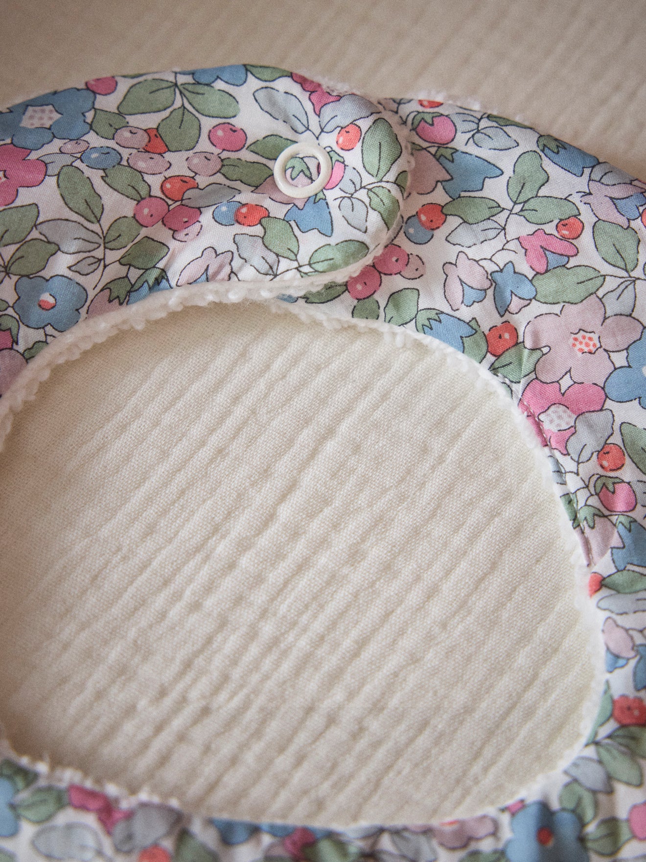 Soft and absorbent loop pile bib on one side and Liberty fabric on the other. Bib adjusts to the size of the neck with 2 press-studs. A refined piece that will grow with baby.