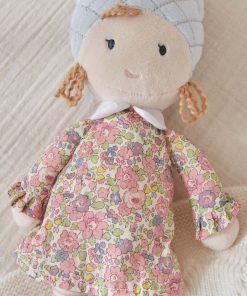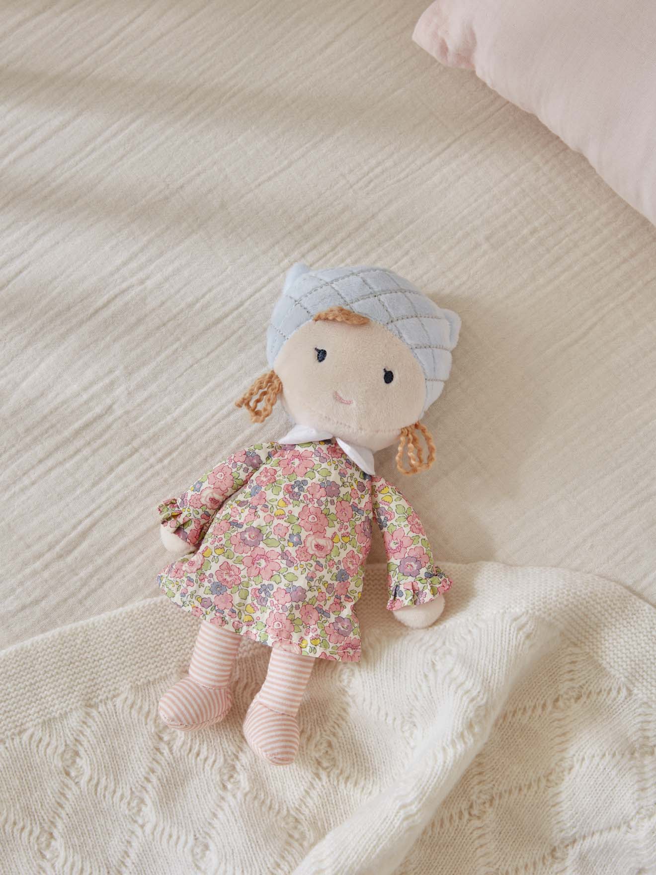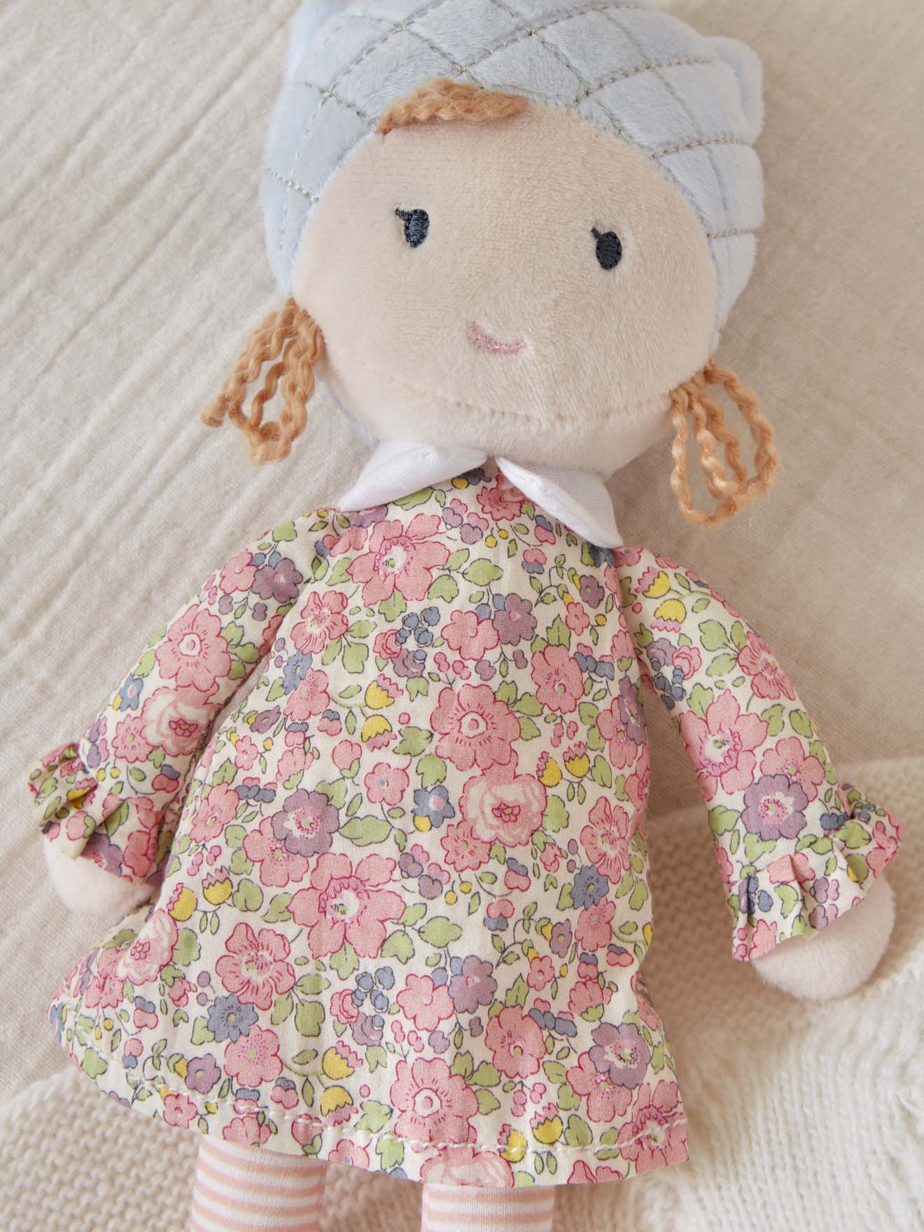 All soft and cute, this fabric doll is adorable. You’ll love her sweet, embroidered little face. Her dress is made with Liberty fabric.