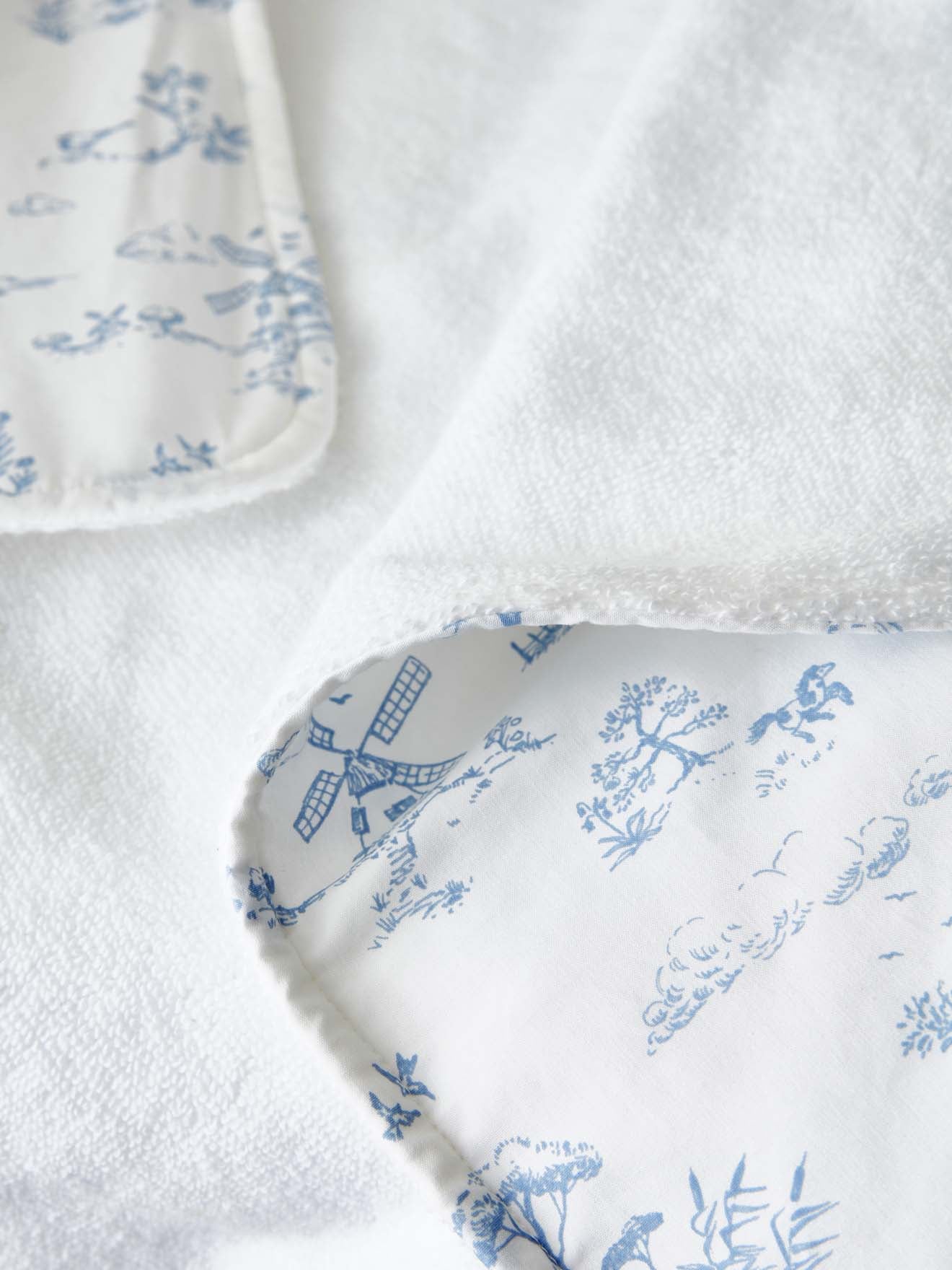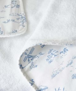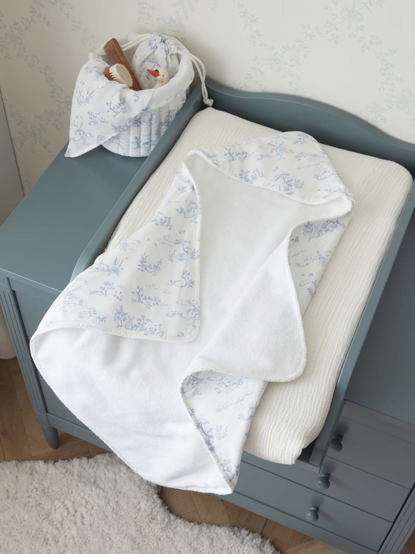 A baby’s bath cape made in Portugal with organic cotton percale. The hood and absorbent towelling lining are ideal for wrapping up the little ones after their bath. Our stylist’s elegant and poetic print is a childish re-interpretation of the well-known toile de Jouy print.