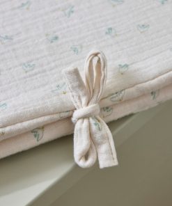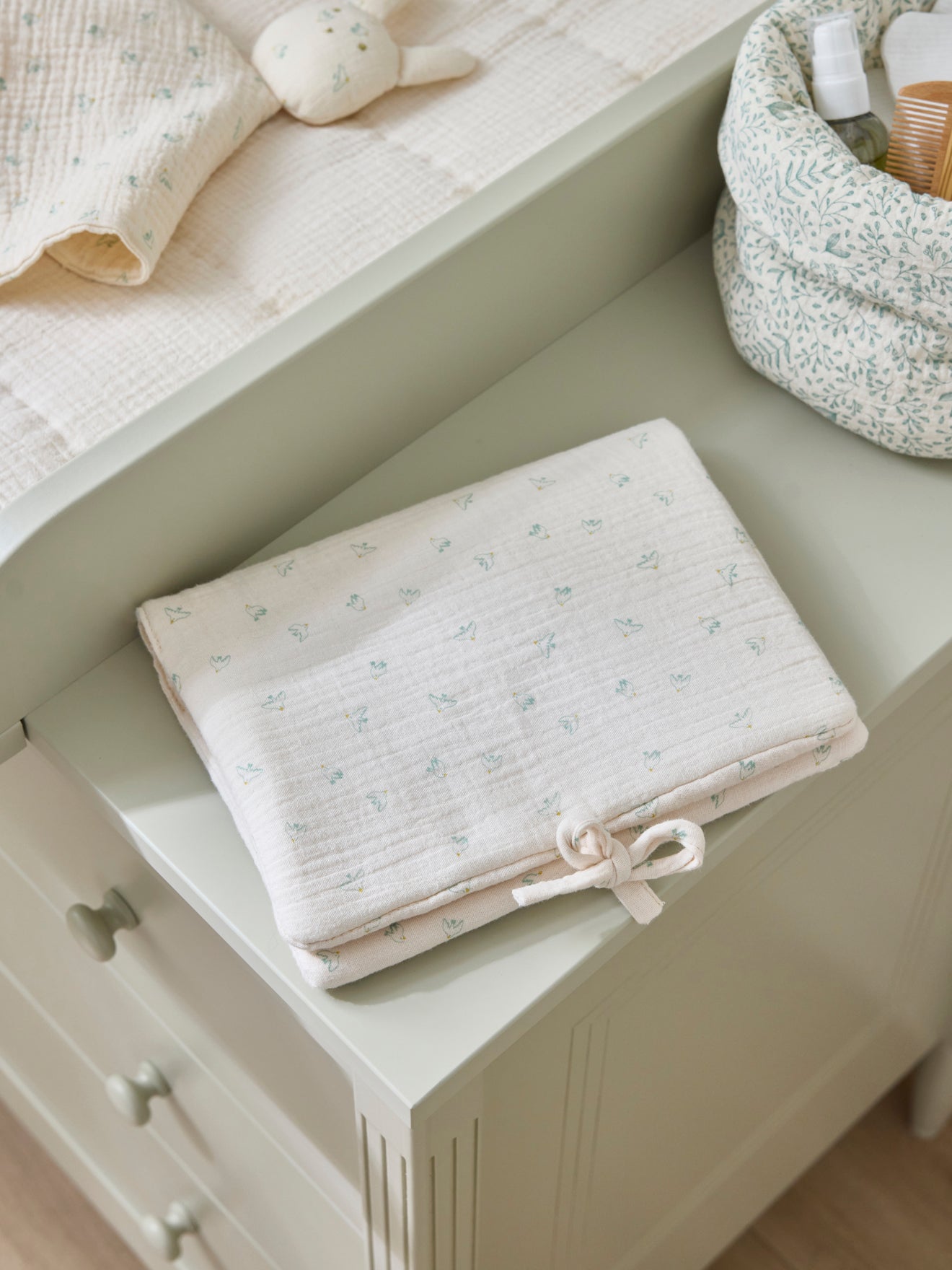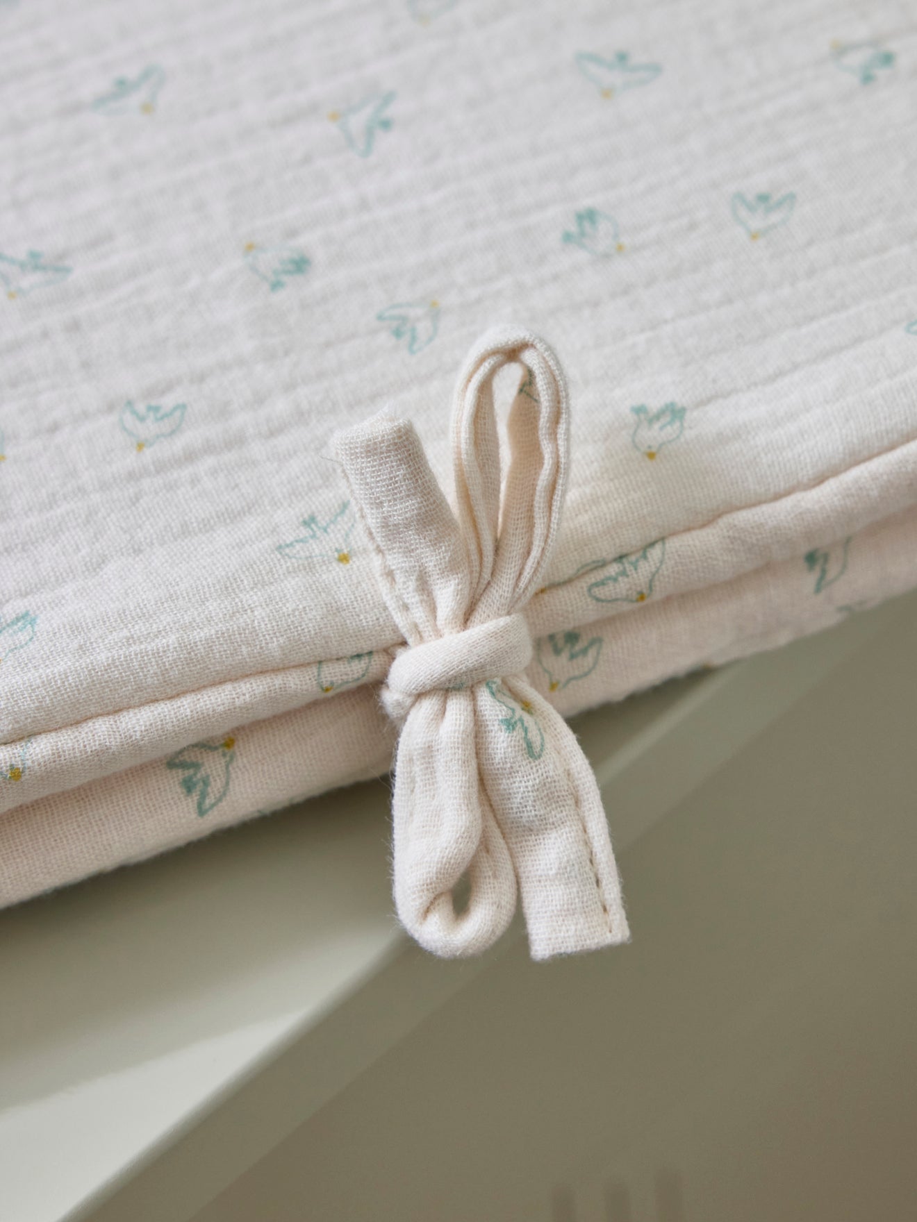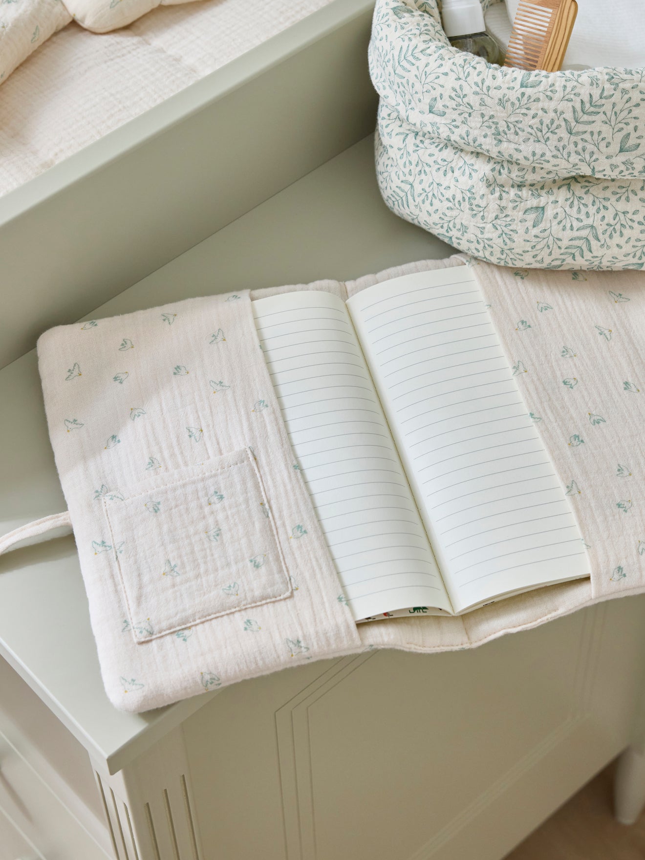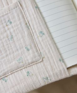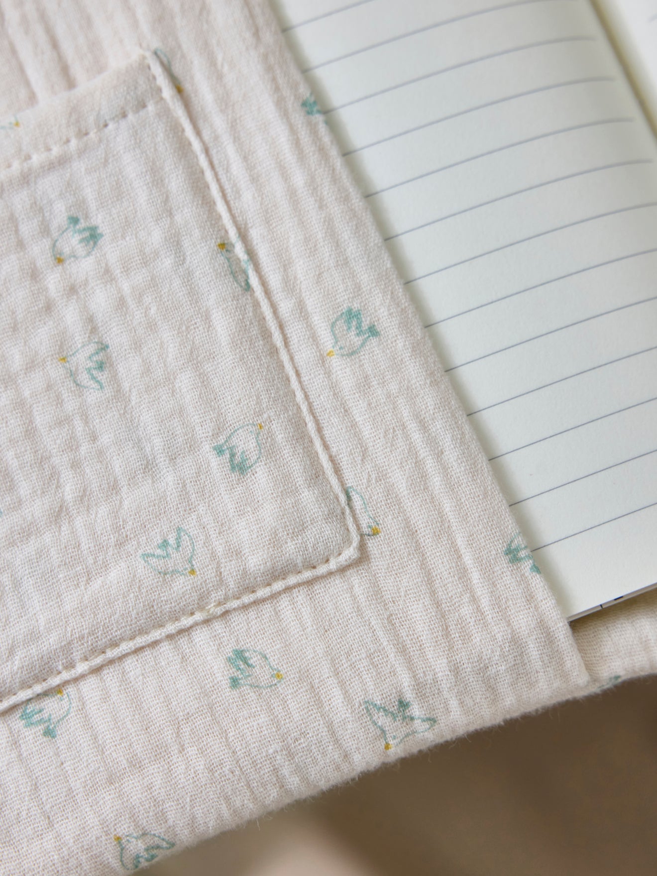 Padded cotton gauze notebook protector with an all-over swallows print. Small patch pocket inside with tie fastening.