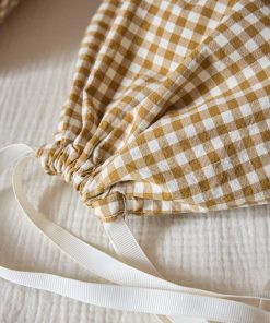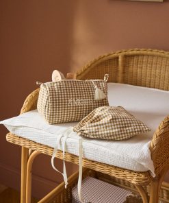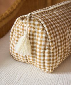 Trousse de toilette matelassée en coton vichy tissé-teint. Broderie Amour sur un côté. 4 poches plaquées à l’intérieur. Fermeture par glissière et pompon en coton. Livrée avec un pochon en tissu assorti.