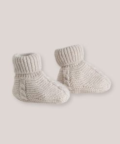 Garter stitch bootees heightened with a narrow cable create a soft and warm cocoon to protect baby’s delicate feet.