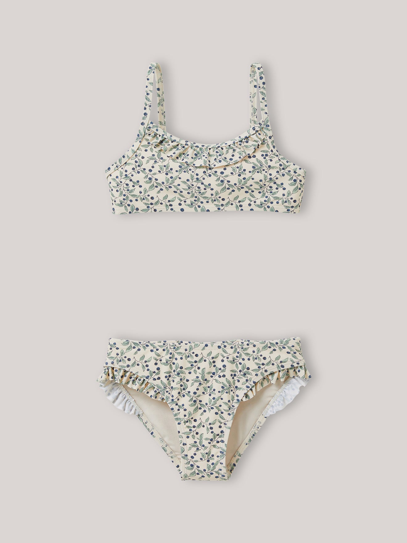 This frilly swimsuit starts with our exclusive Olivia print. The swimsuit material is especially soft and it dries quickly. A floral set with bottoms and a bra top with a wide smocked back.