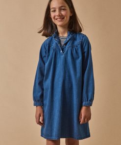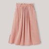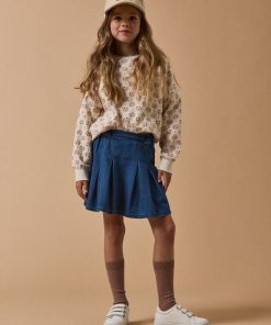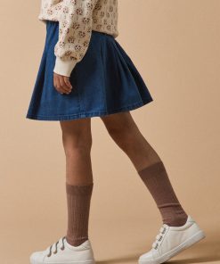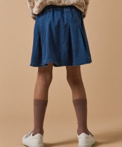 La jupe en denim adopte une coupe évasée et de larges plis creux.