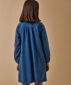 La jupe en denim adopte une coupe évasée et de larges plis creux.