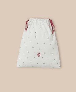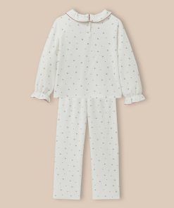 Un pyjama en velours, animé par un imprimé délicat et un croquet contrasté.