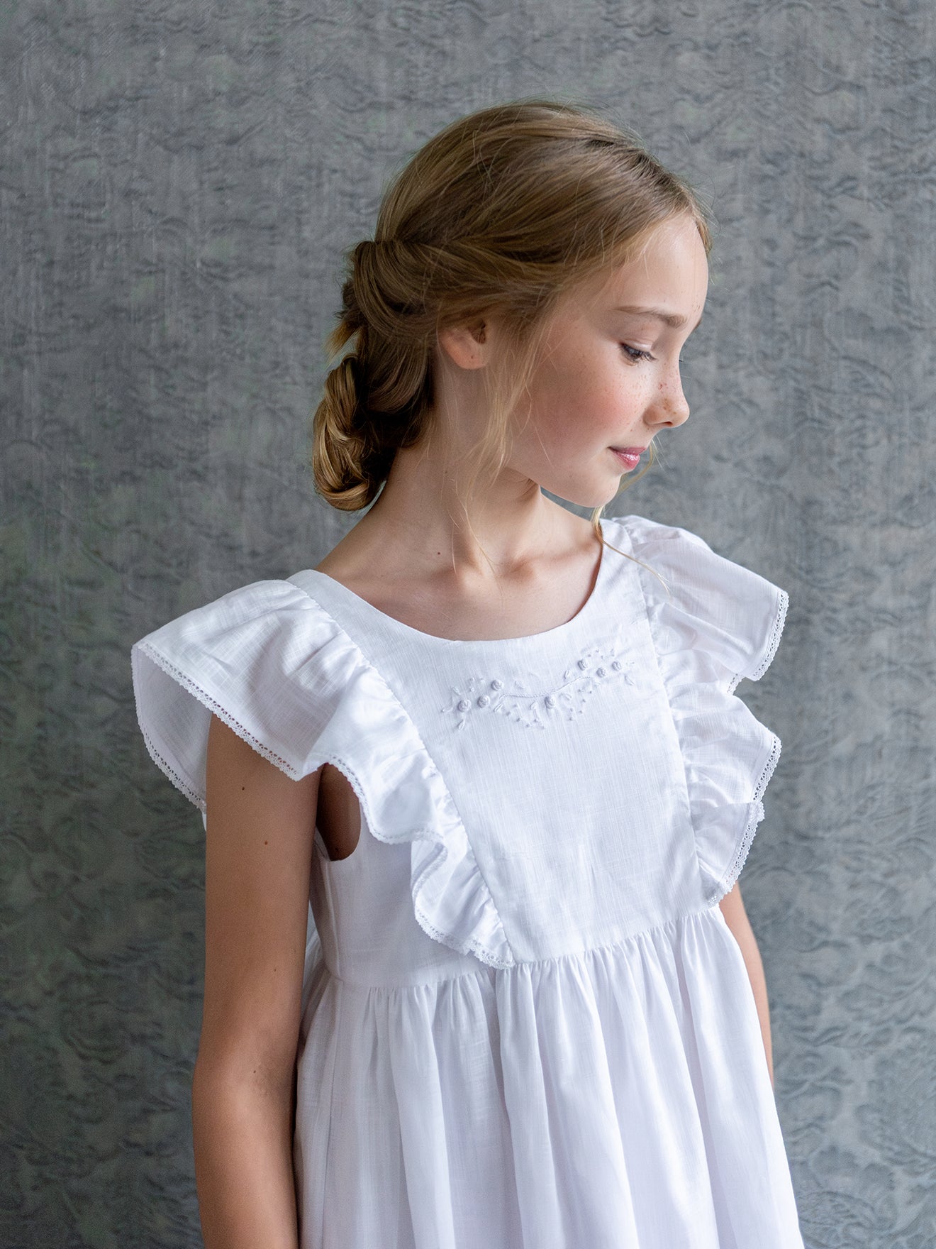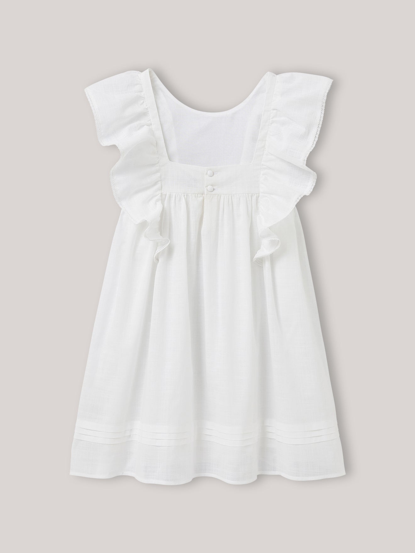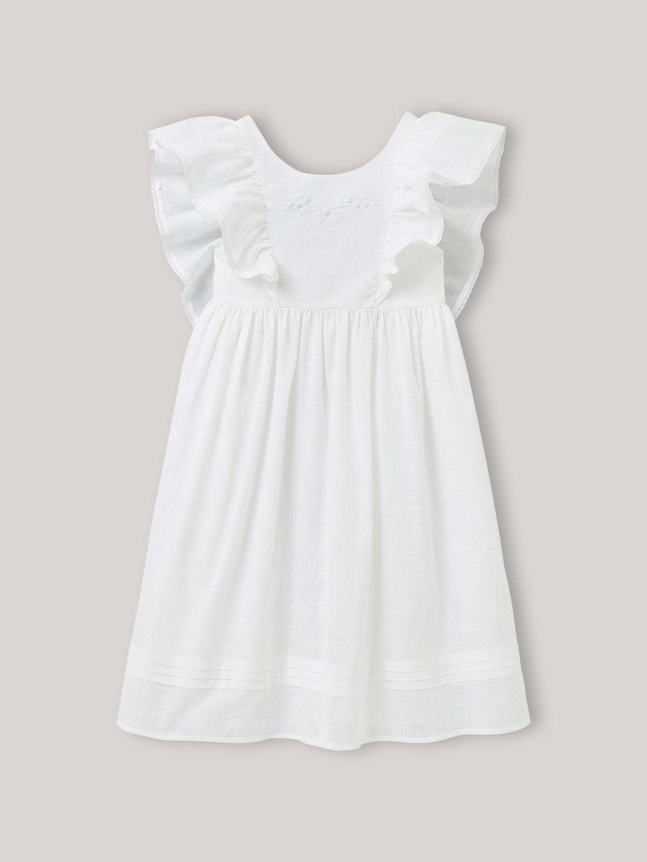 Sleeveless bridal party dress with wide ruffles on the shoulders trimmed with narrow lace. Floral embroidery on the bib, gathers from the seam, pintucks around the hem and tone-on-tone lining. Lightly structured woven cotton delivers a textured linen-like effect. Wide square back neckline with 2 covered buttons.