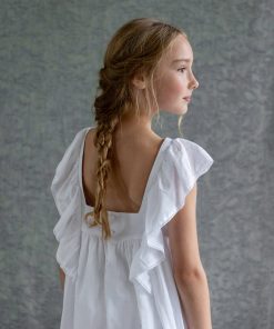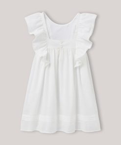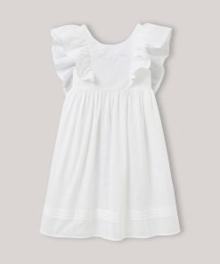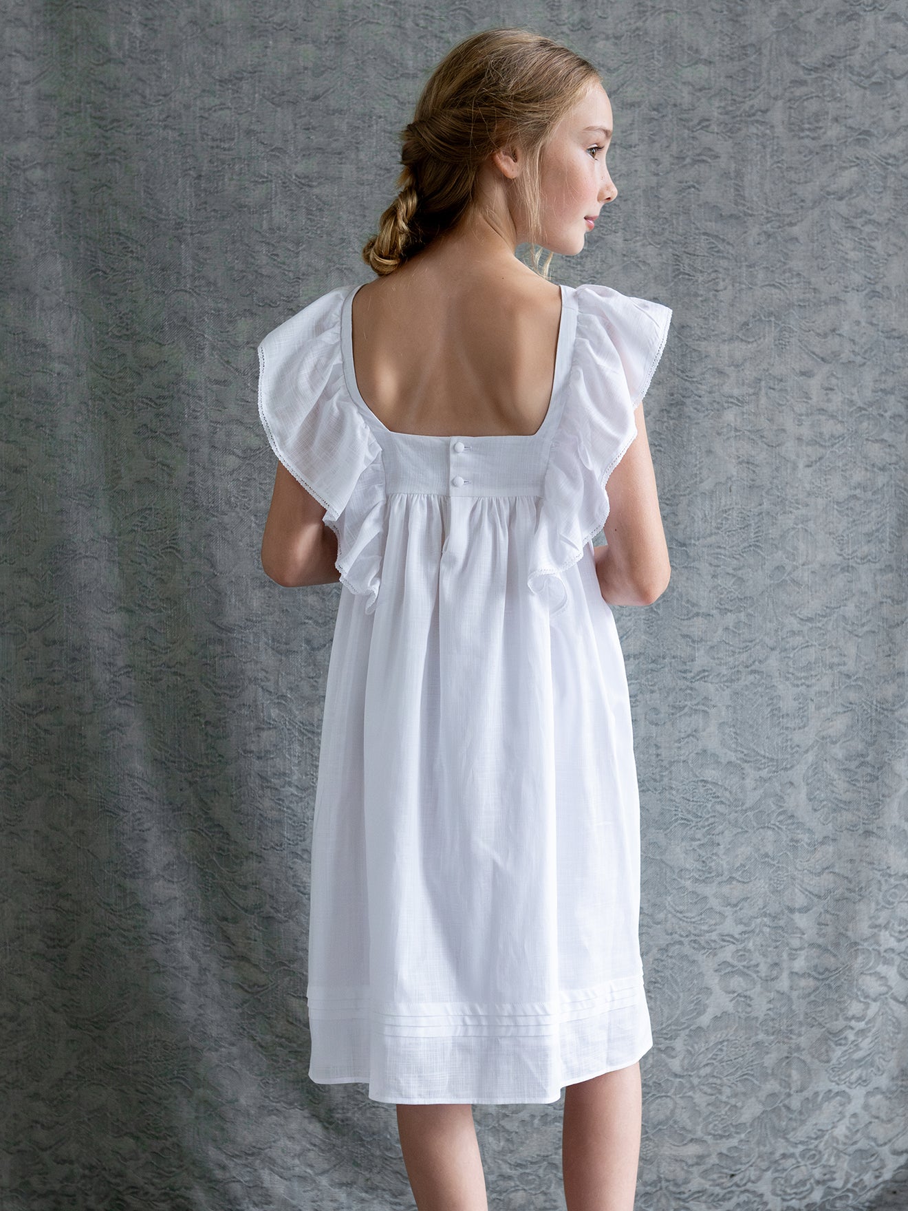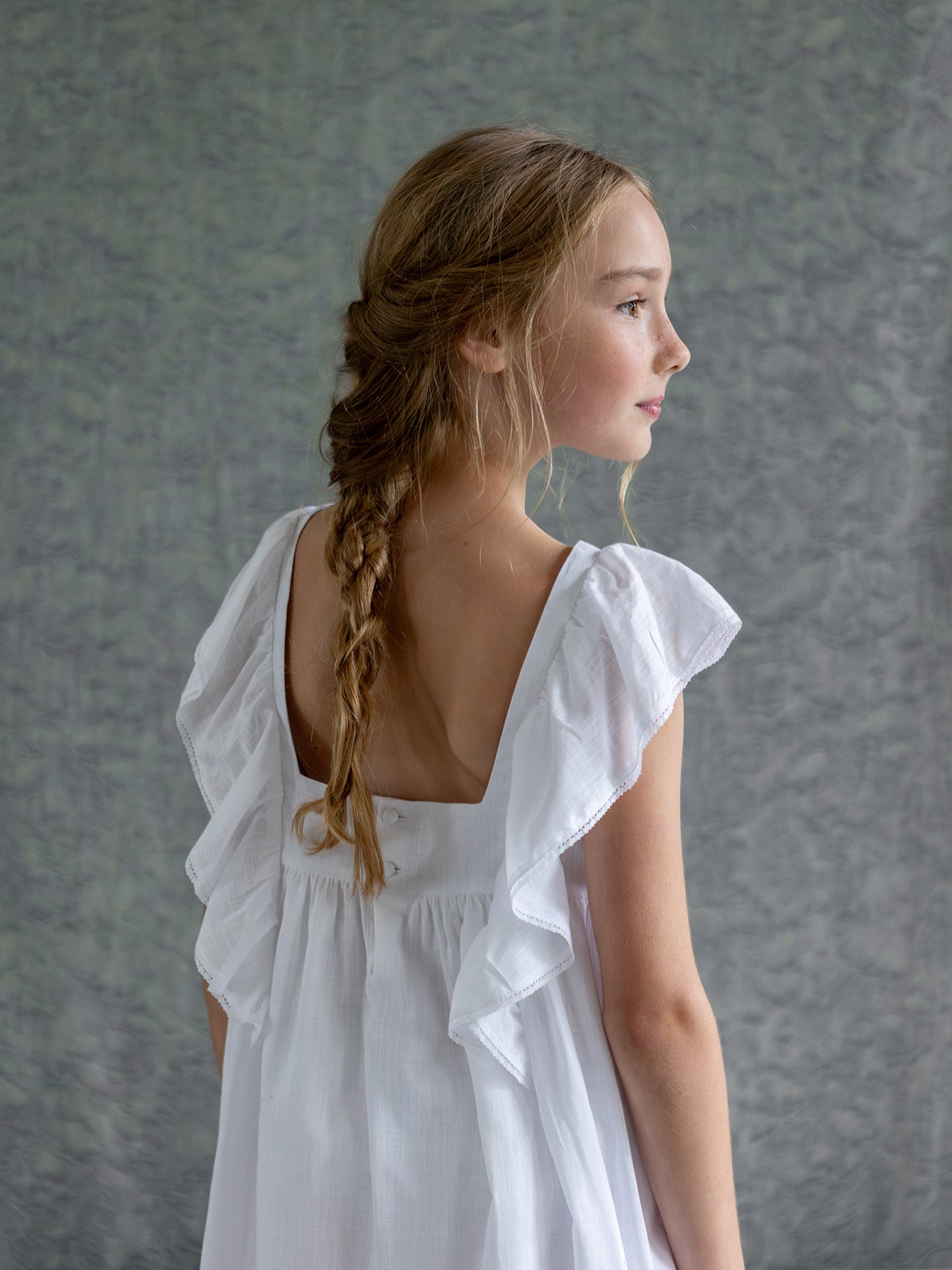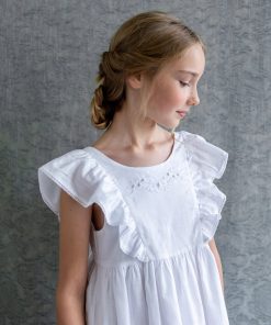 Sleeveless bridal party dress with wide ruffles on the shoulders trimmed with narrow lace. Floral embroidery on the bib, gathers from the seam, pintucks around the hem and tone-on-tone lining. Lightly structured woven cotton delivers a textured linen-like effect. Wide square back neckline with 2 covered buttons.