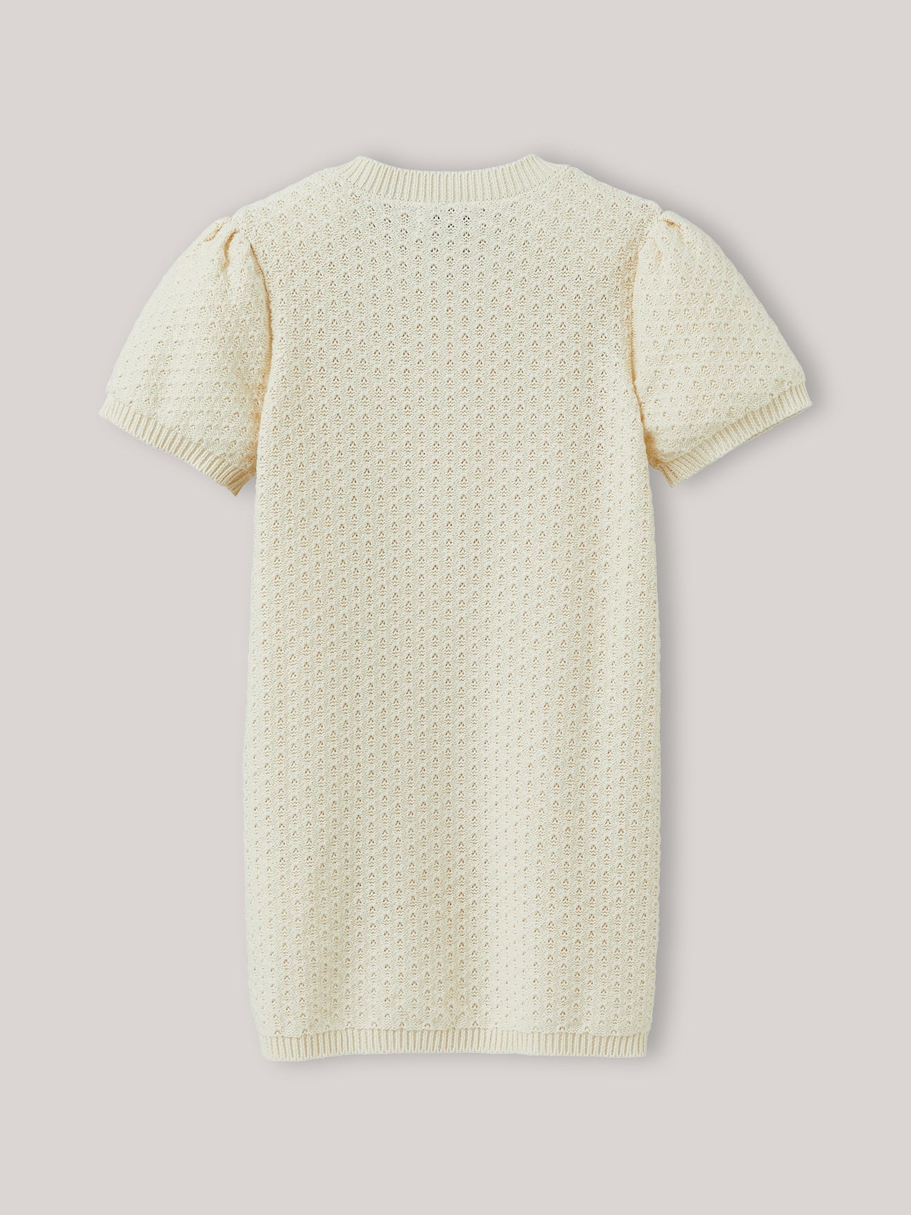 Knit dress with short sleeves and gathered caps. A lightweight dress that’s comfortable and original with sporty chic style. Light openwork patterned knit, front button placket and ribbed edge finish.