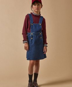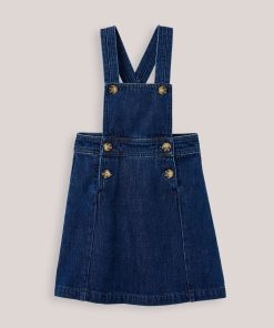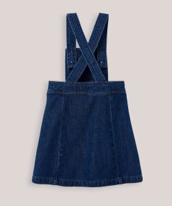 Denim dress with crossover straps at back. Retro look for assertive style.