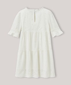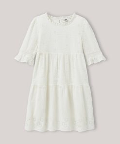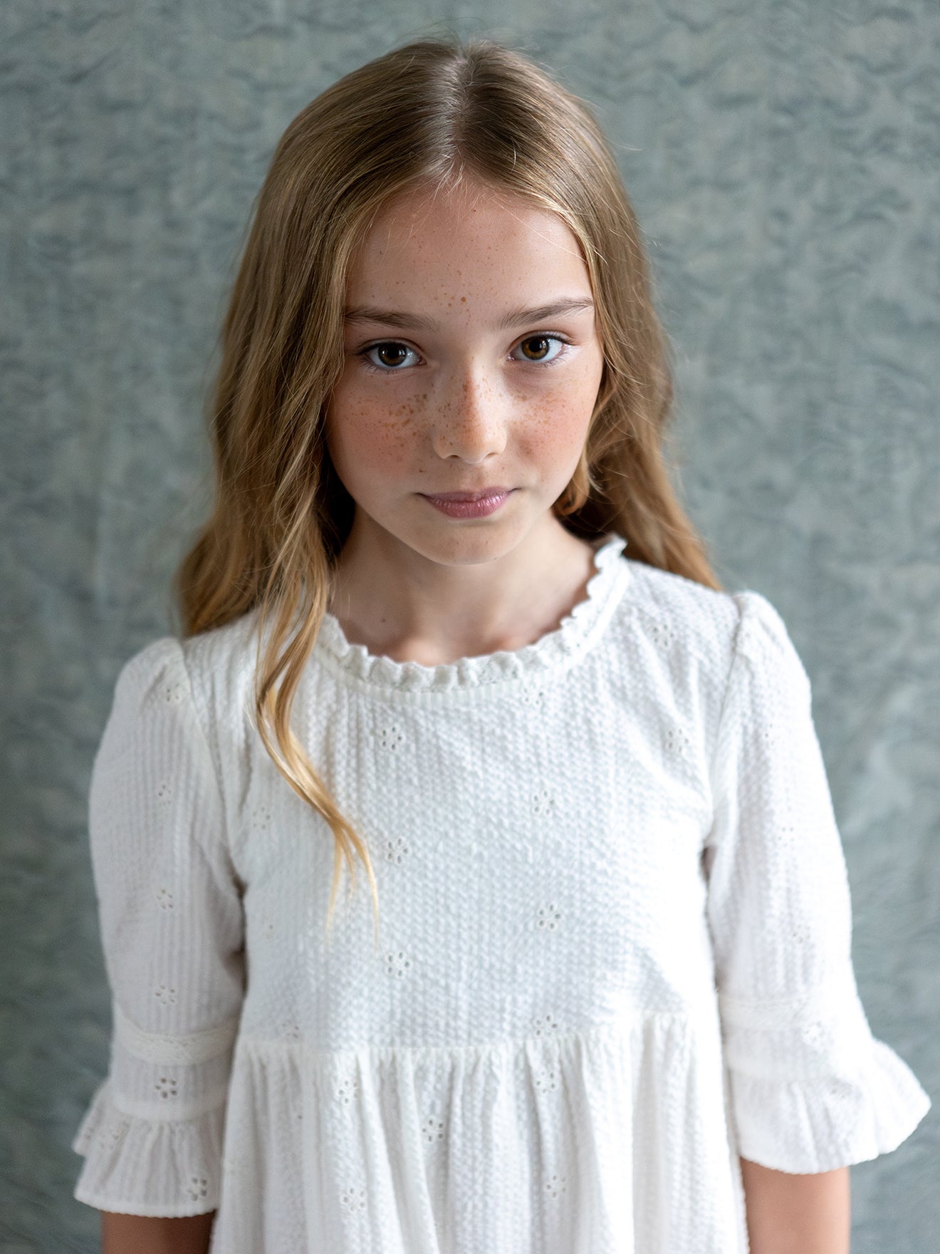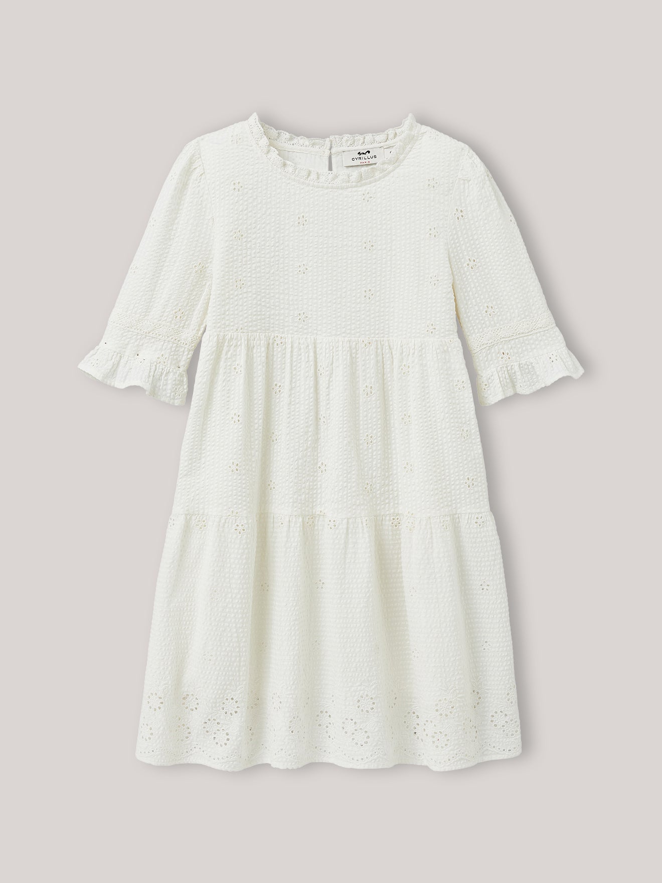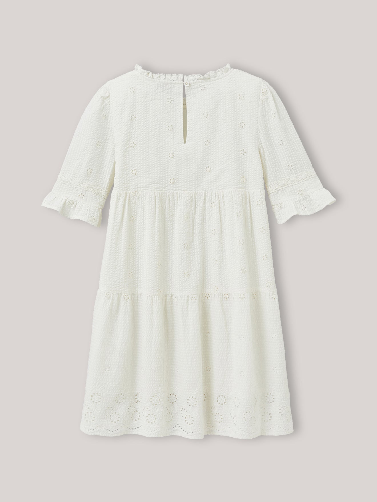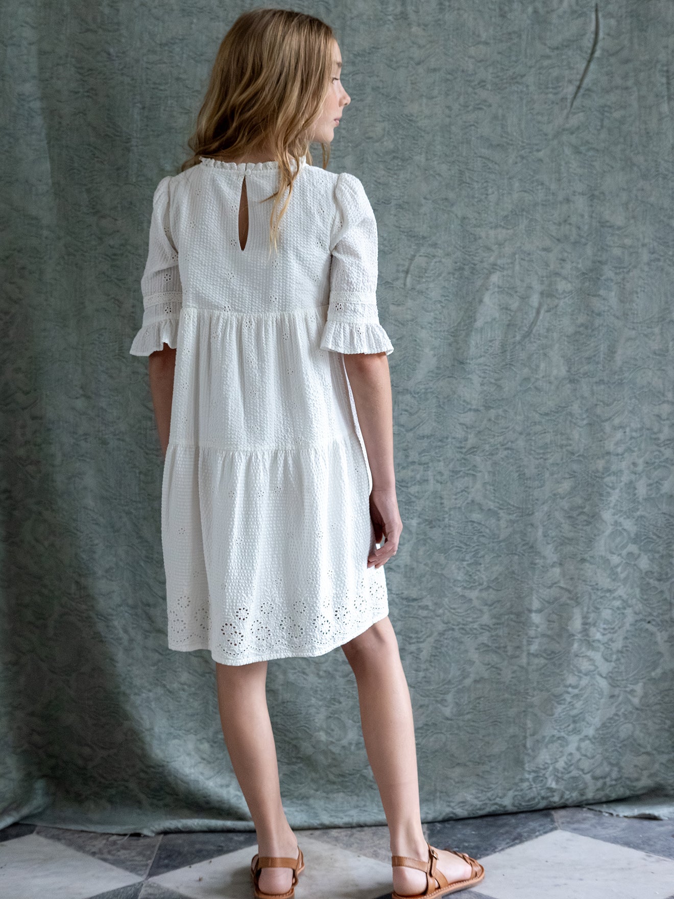 A chic bohemian dress made with seersucker inset with small broderie anglaise flowers. Round neckline trimmed with a lace ruffle. Sleeves with slightly gathered shoulders and lace appliqué band and wide ruffle at the elbow.
