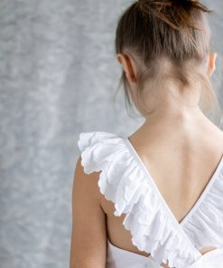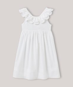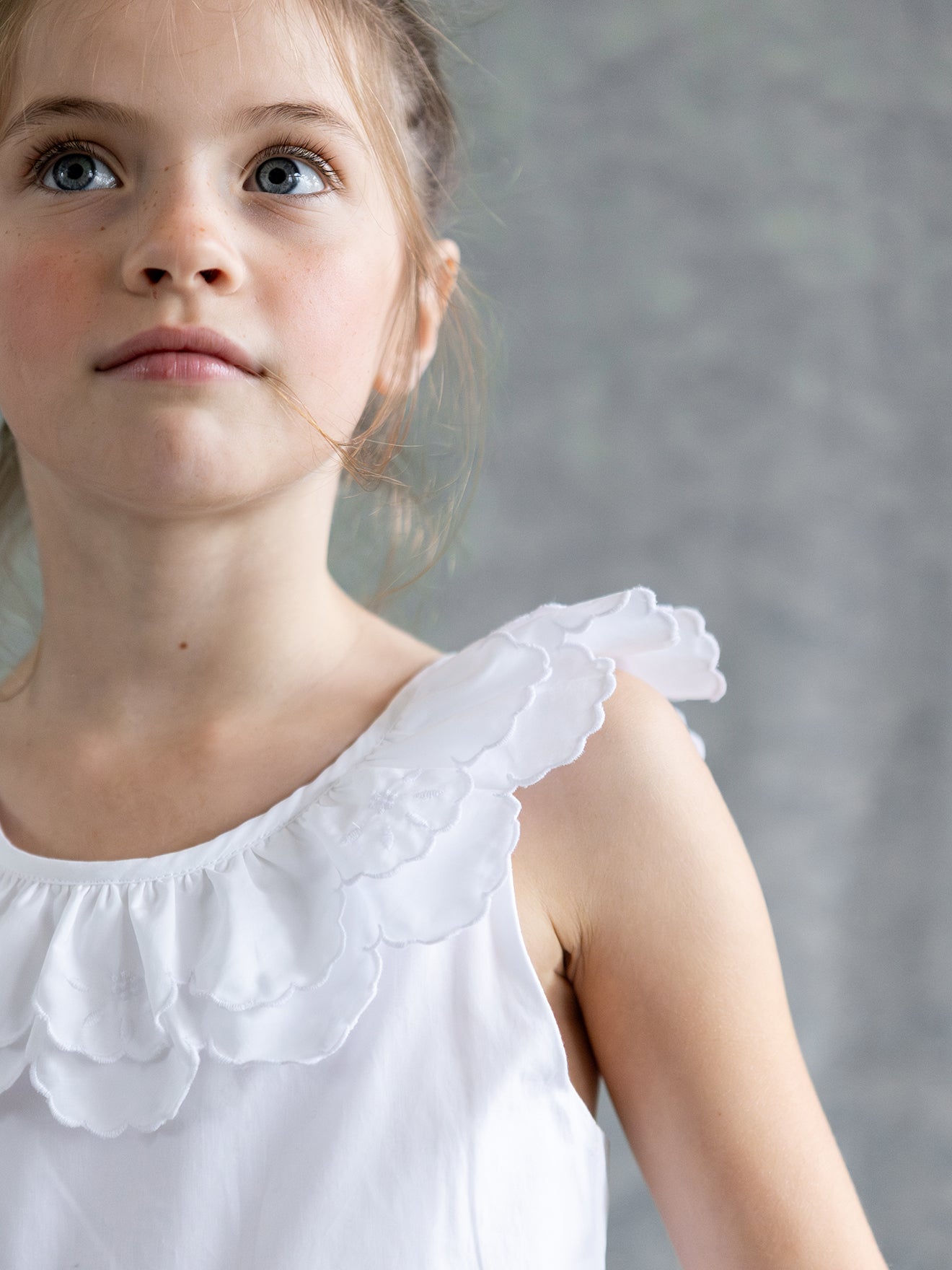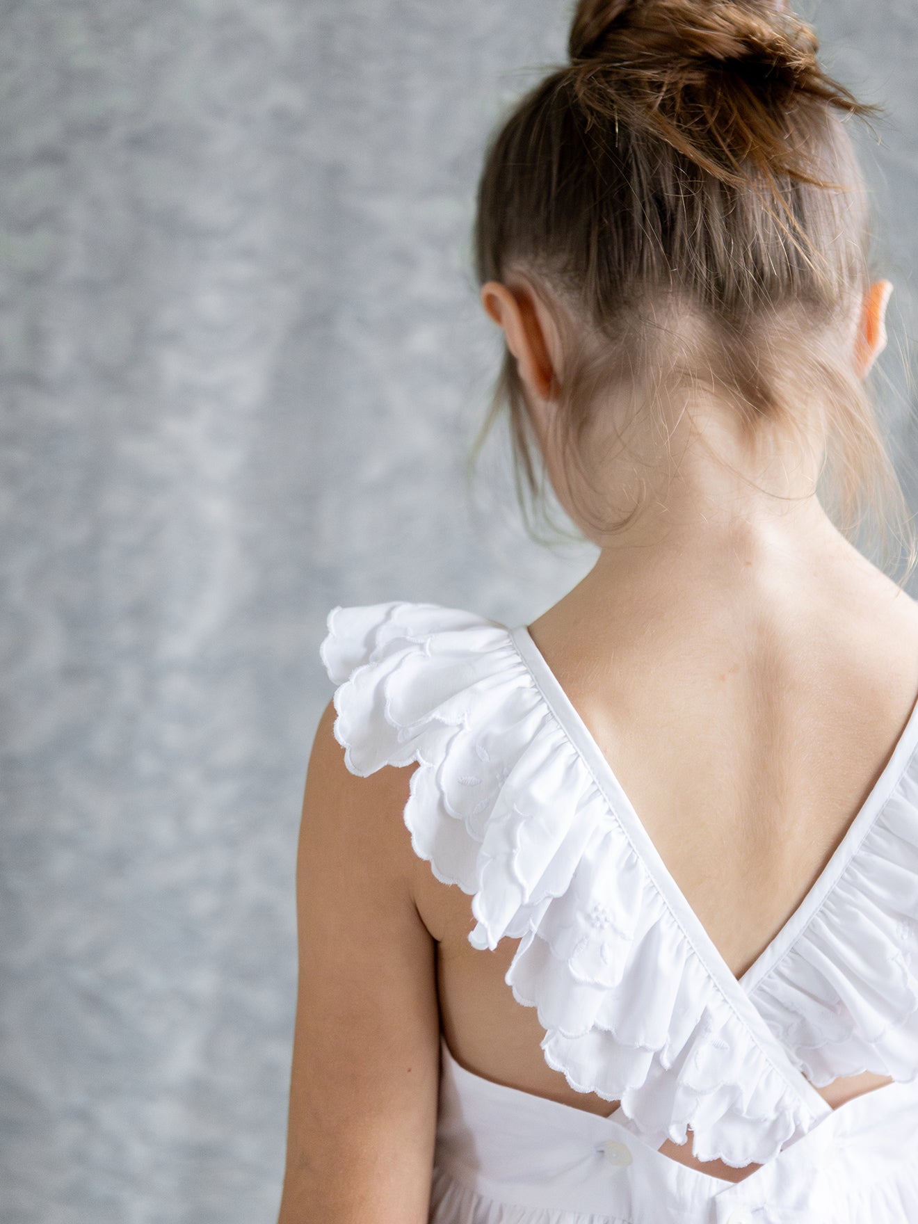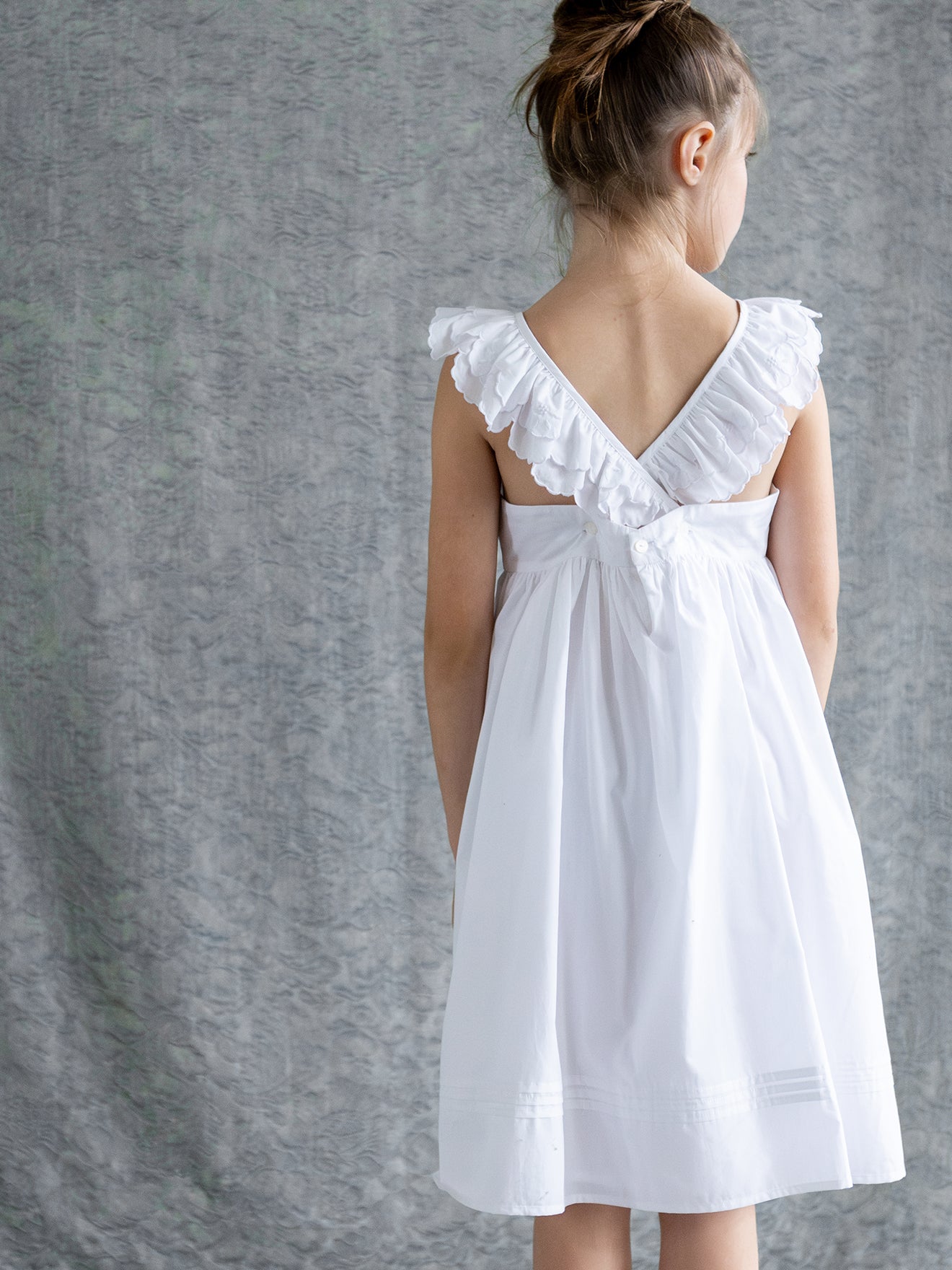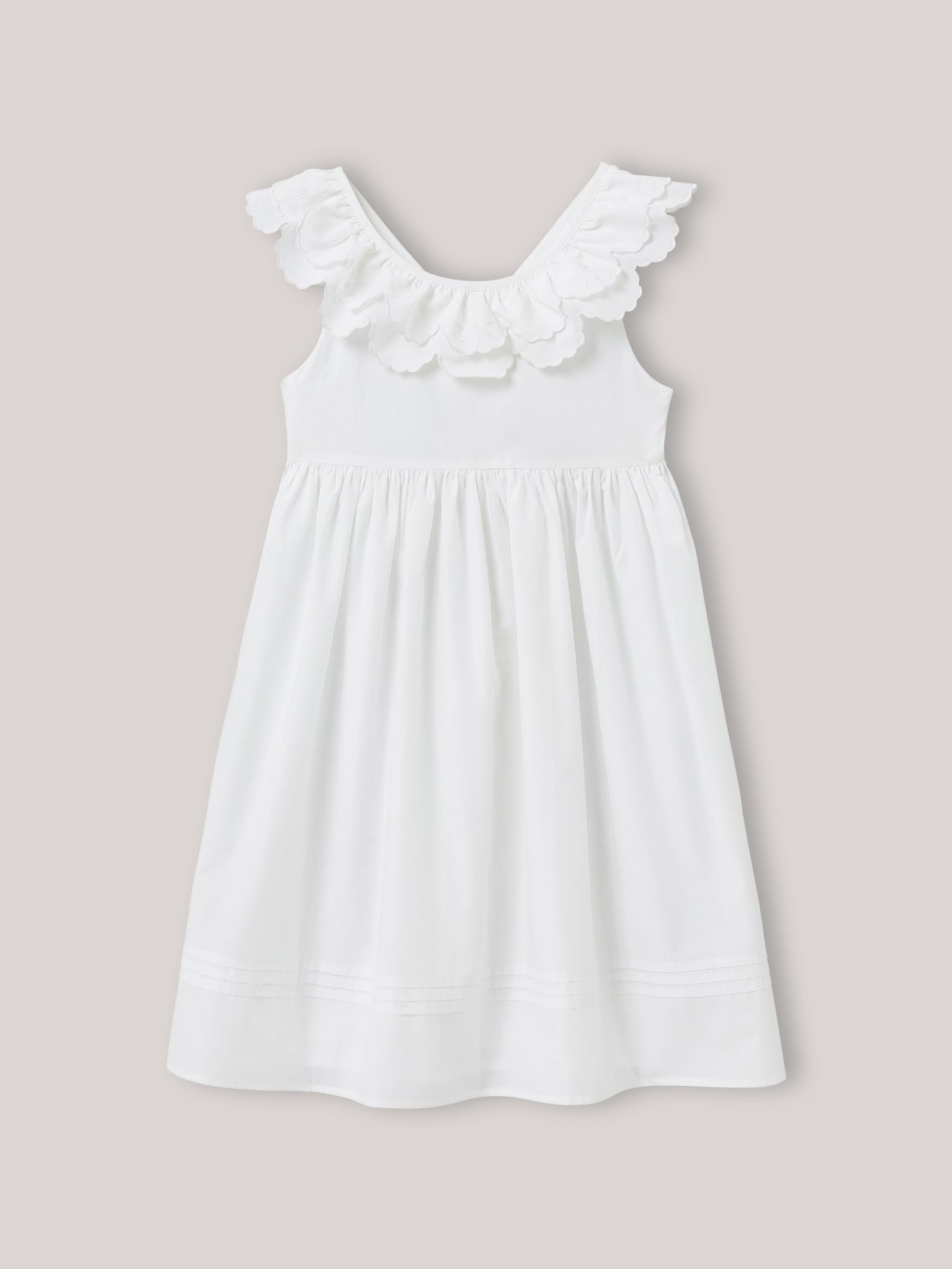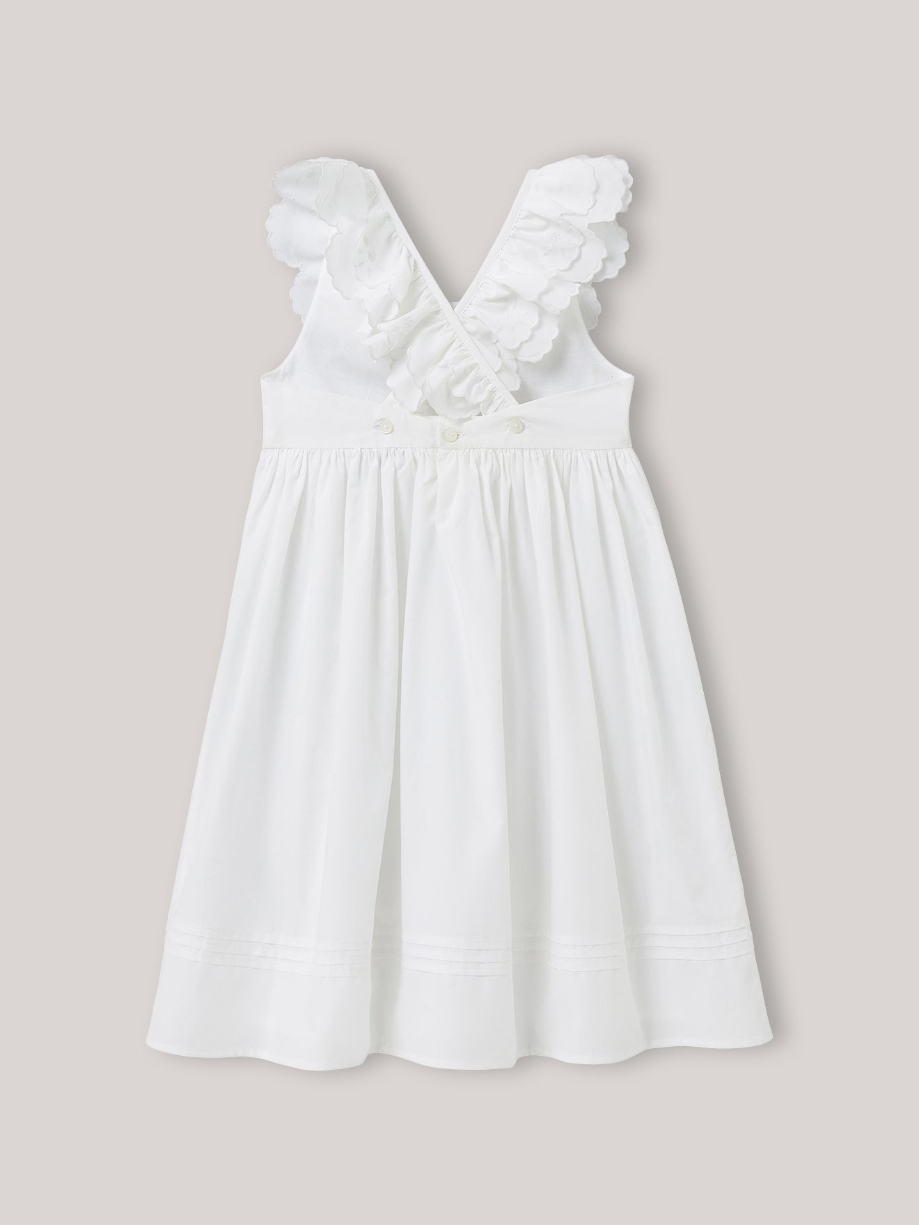 Cotton poplin dress with pintuck pleats around the hem. Wide double embroidered and scalloped collar. Back crossover straps. Poetic style that combines originality and refinement. Perfect for summer celebrations.