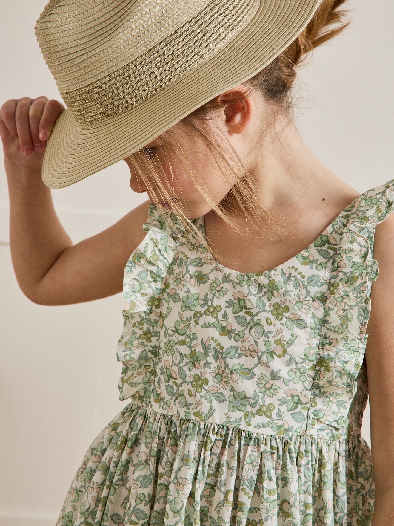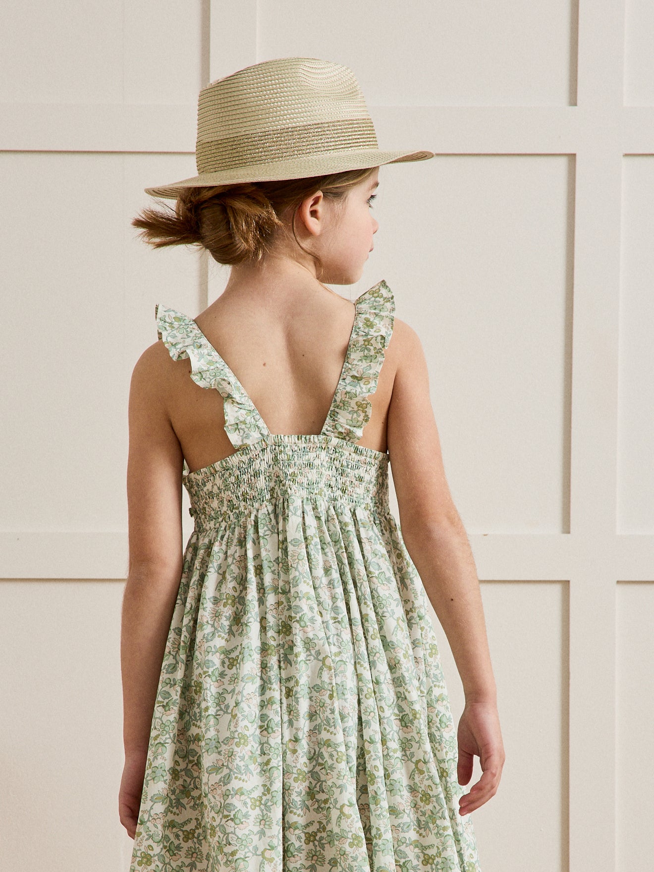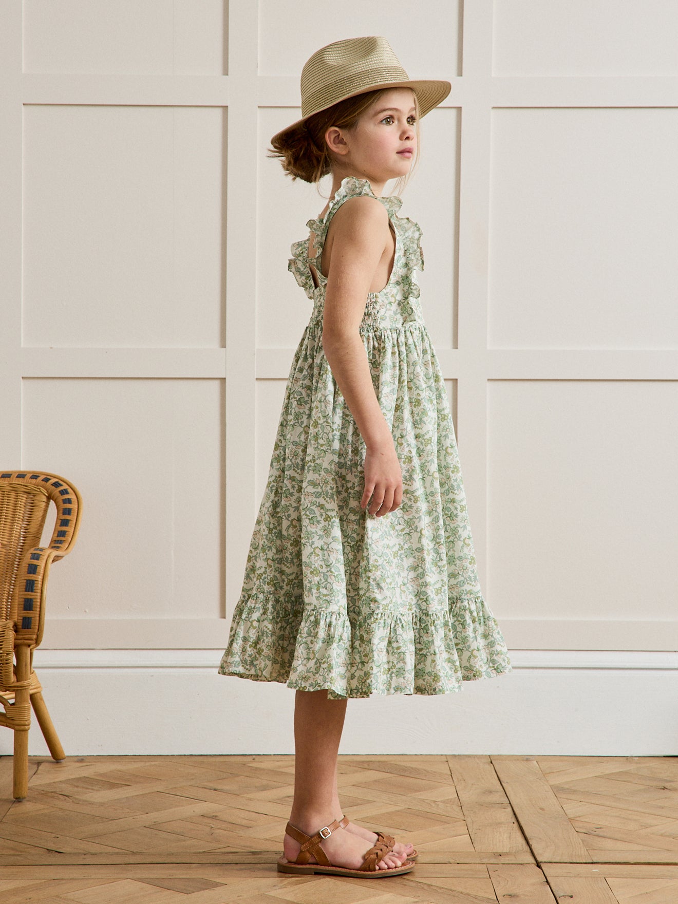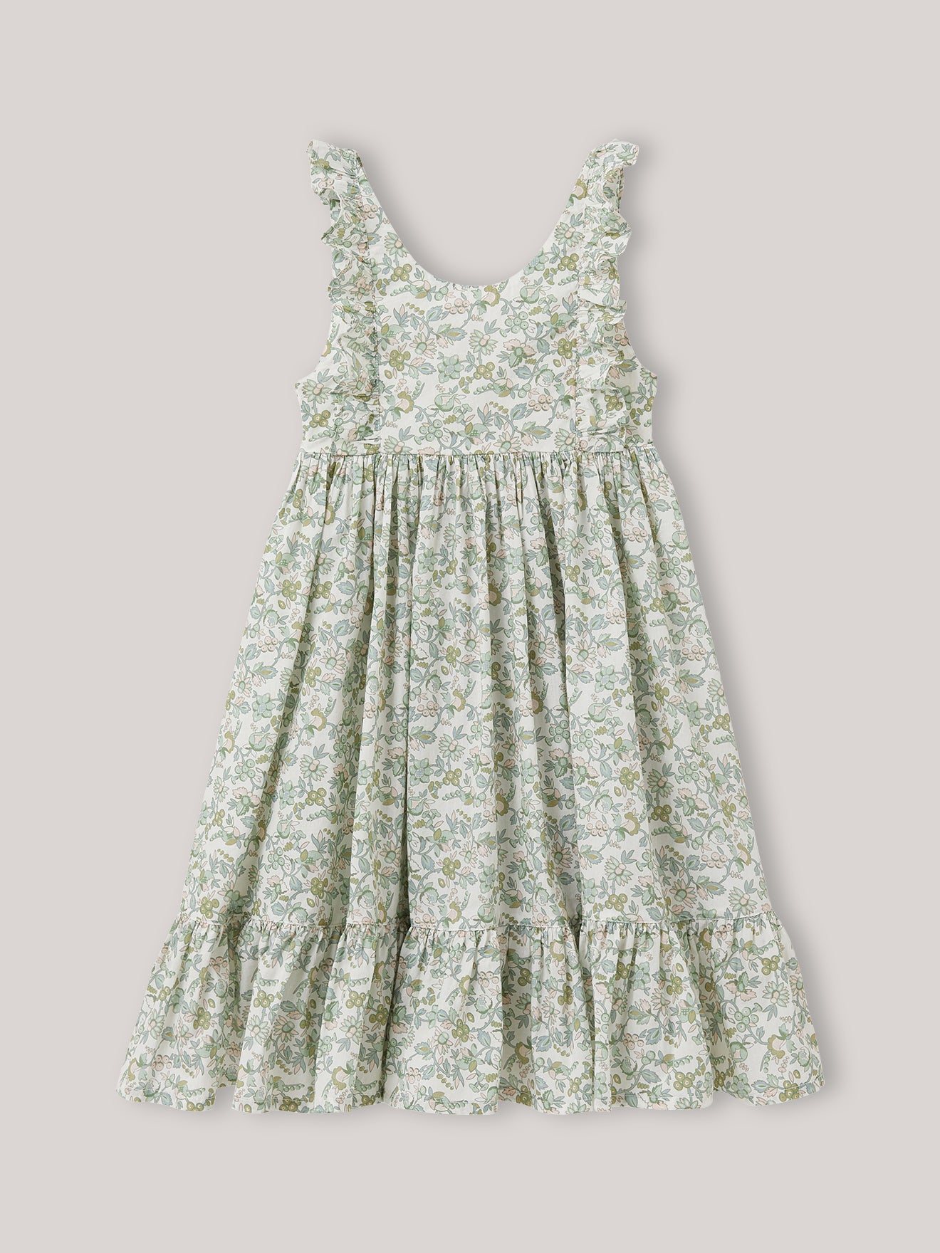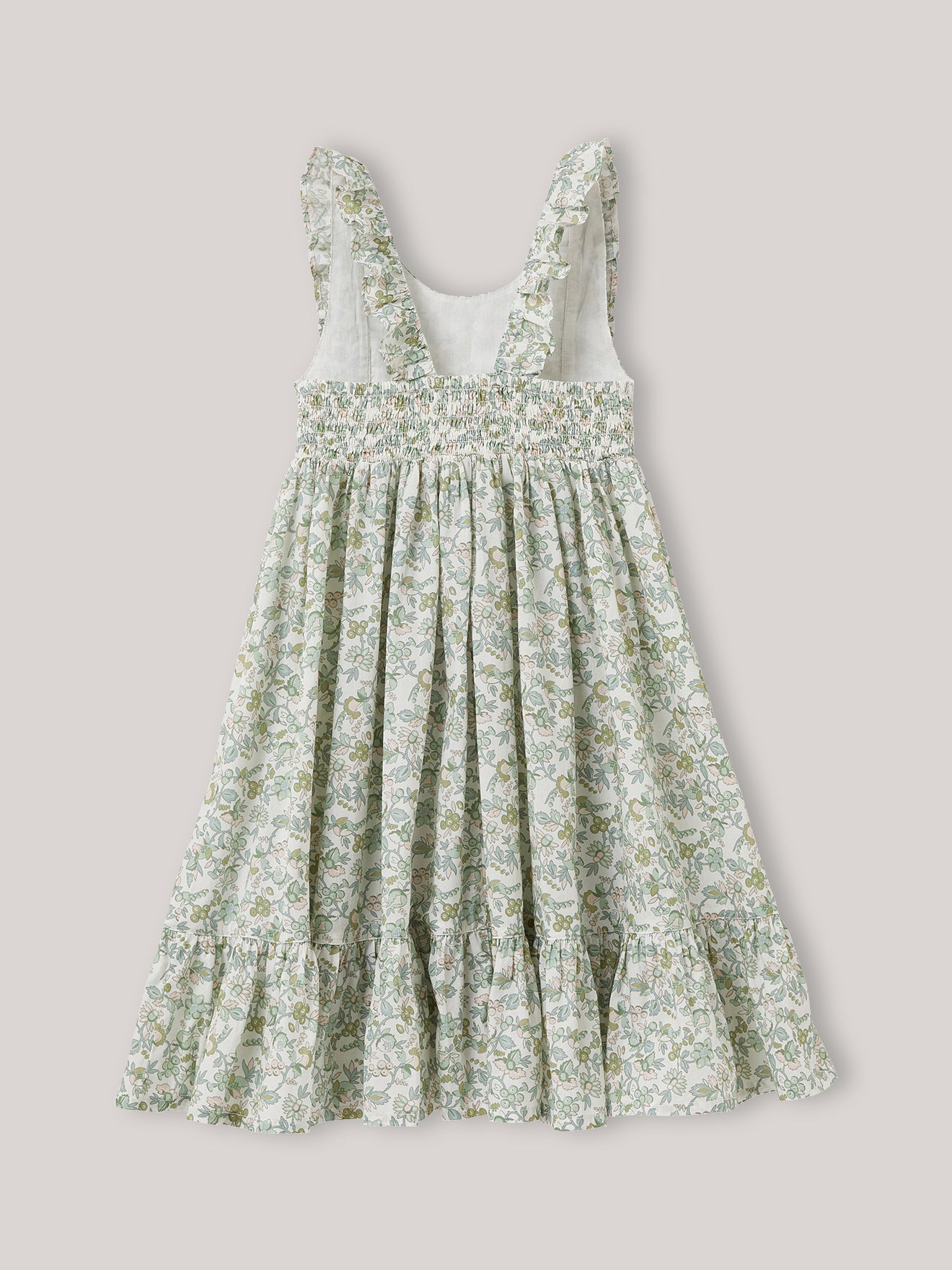 Sundress with a swingy shape in a Mireille-print pure cotton fabric. Mireille is a tender and exclusive floral motif designed by our team of stylists. Wide ruffled straps, back smocked band and wide ruffled hem.