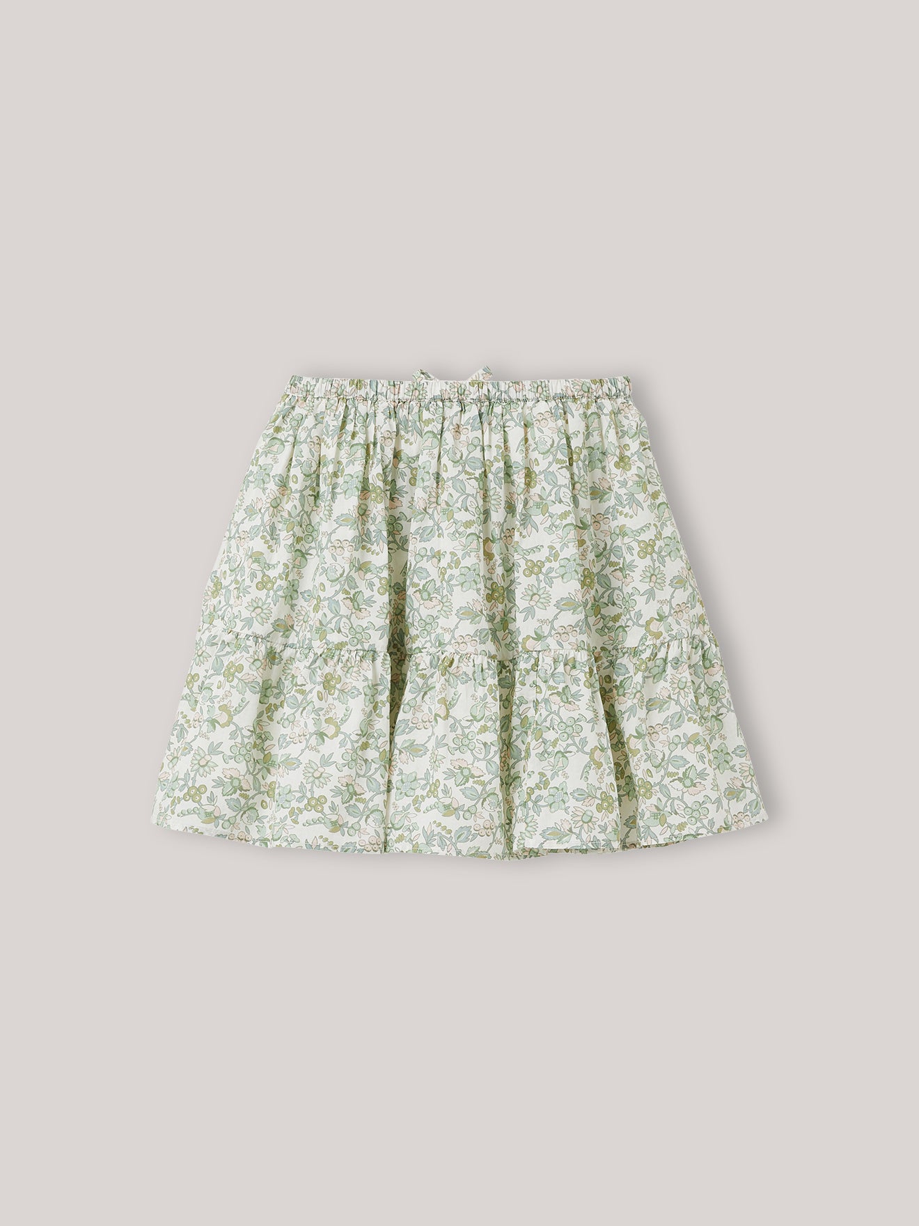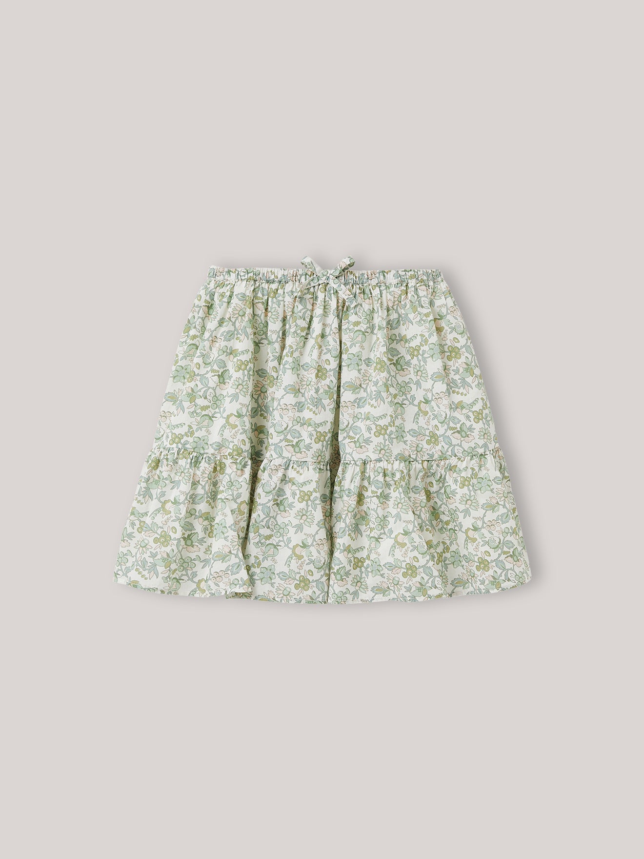 Lightweight cotton and a swingy shape. Skirt with a wide ruffled hem. Fully elastic waistband with small, matching bow. The Mireille print is an exclusive floral motif designed by our team of stylists.