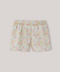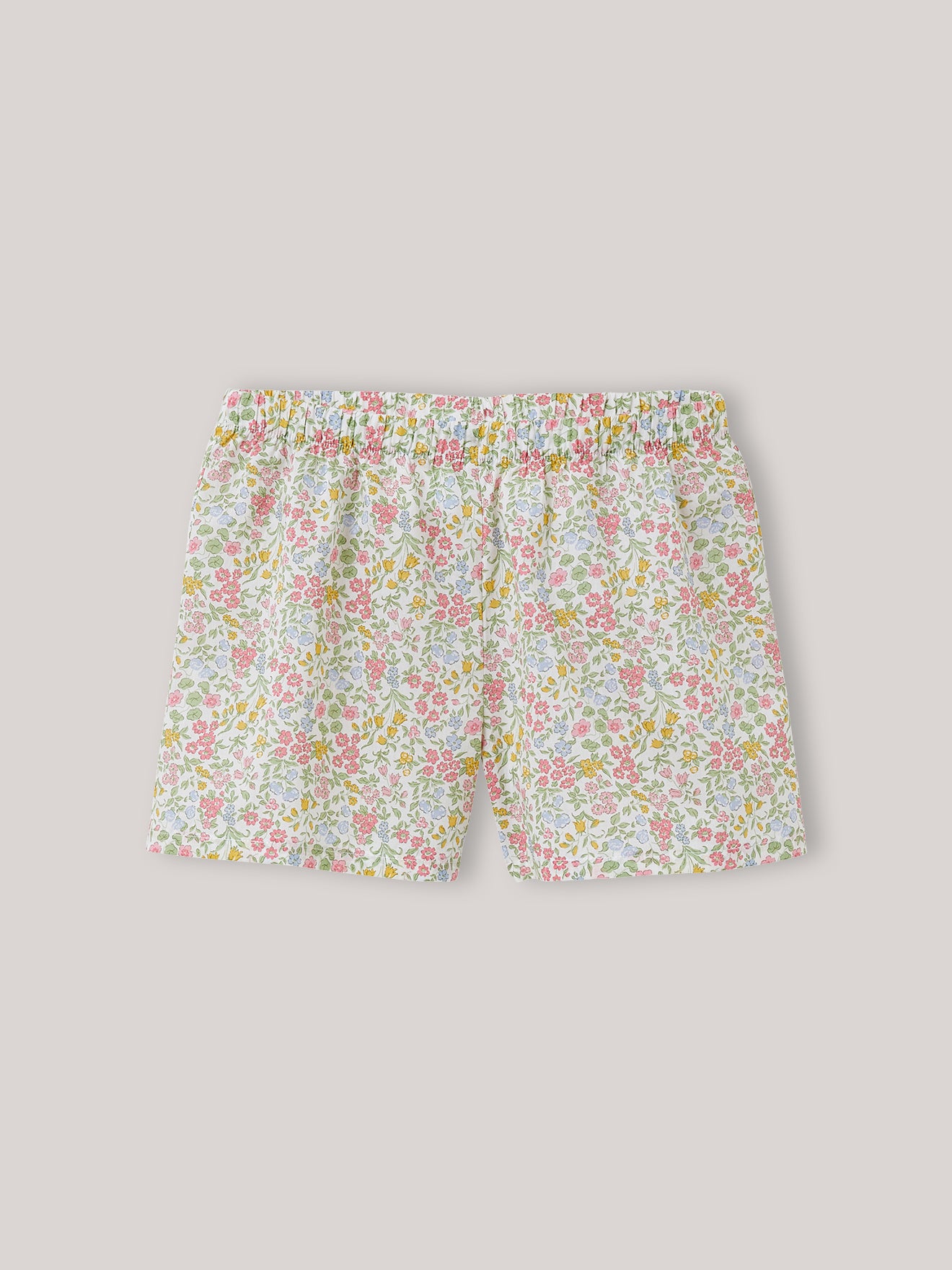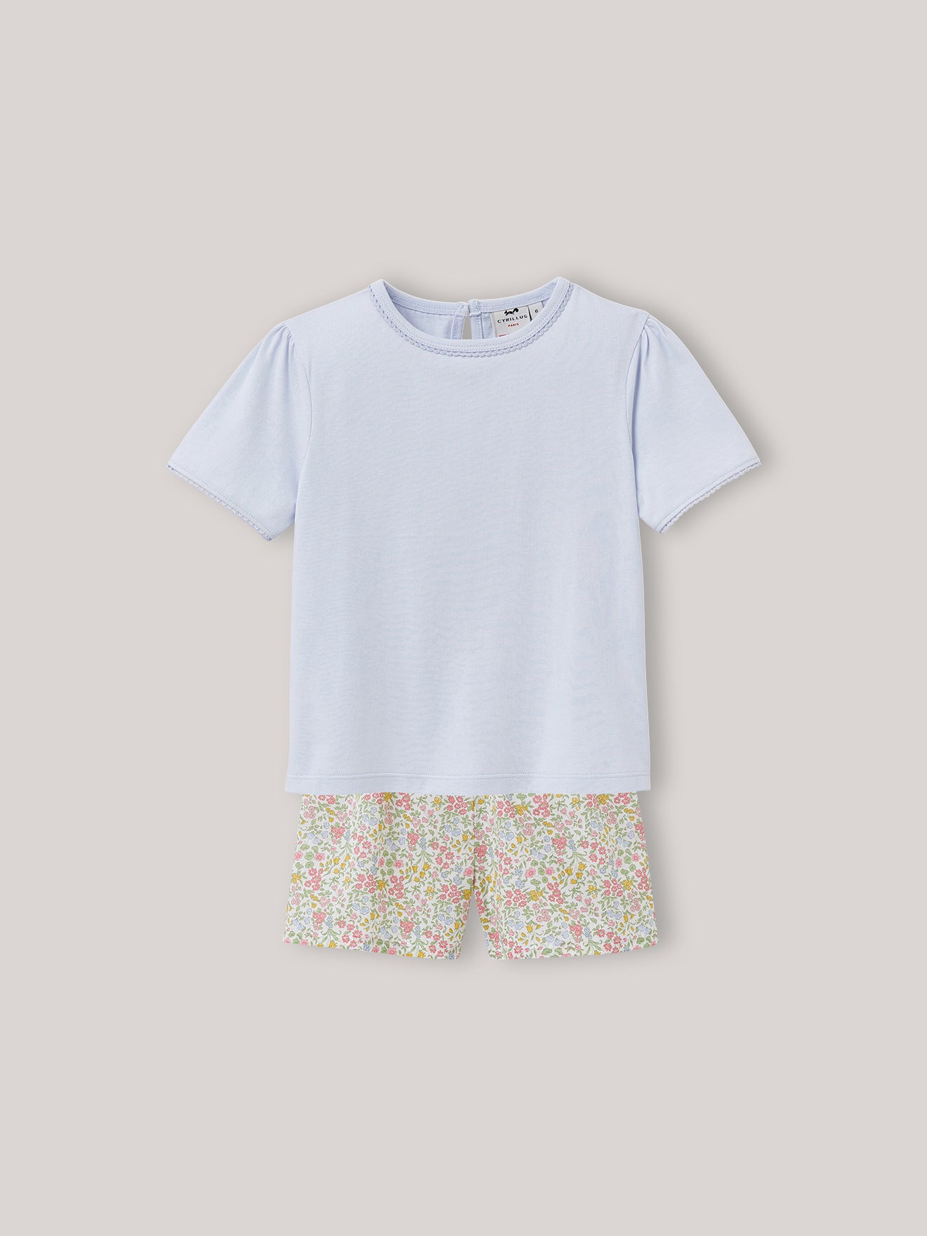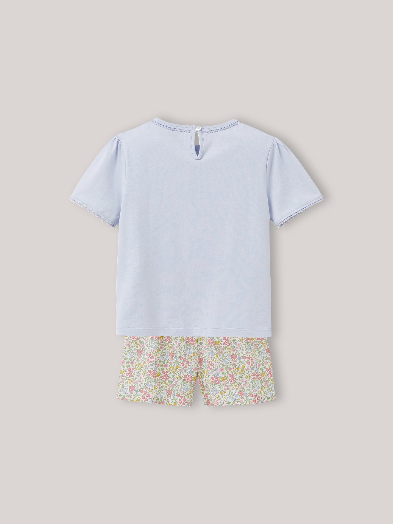 Pyjamas with shorts that are as casual as refined. Shorts made with genuine Liberty fabric and a plain T-shirt with a small flower on the bust and narrow tone-on-tone trim.