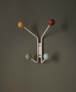This wall coat rack has a painted metal structure with 4 round mango wood hooks. The Alice coat rack is available in 2 versions: a charcoal structure with walnut-tinted wooden balls and a cream structure with multicolored (pink, green and blue) balls. Coat rack made in India. Easy to attach to a wall or a door.