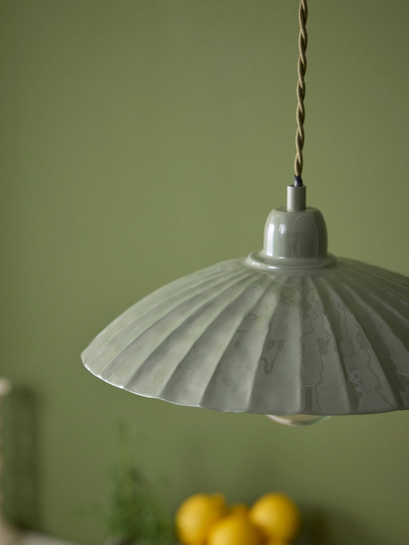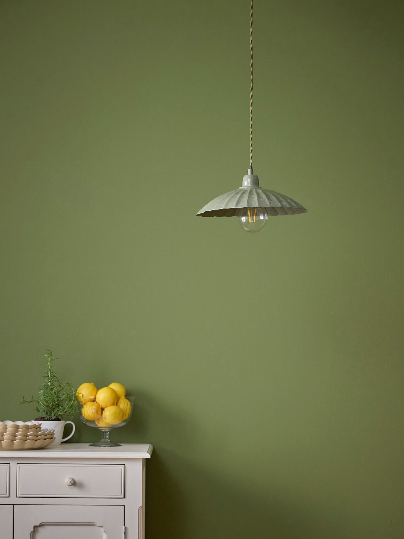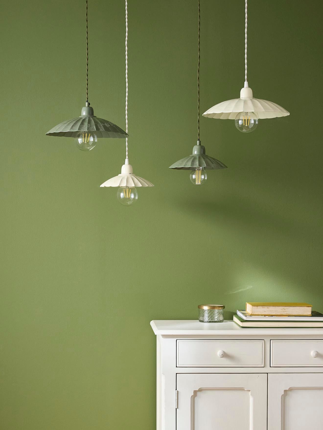 Tulip shaped hanging lamp in painted enameled metal. Classic style updated for today with a filament bulb that contrasts modern and authentic. The long cable allows you to use the Aline hanging lamp as a bedside lamp.