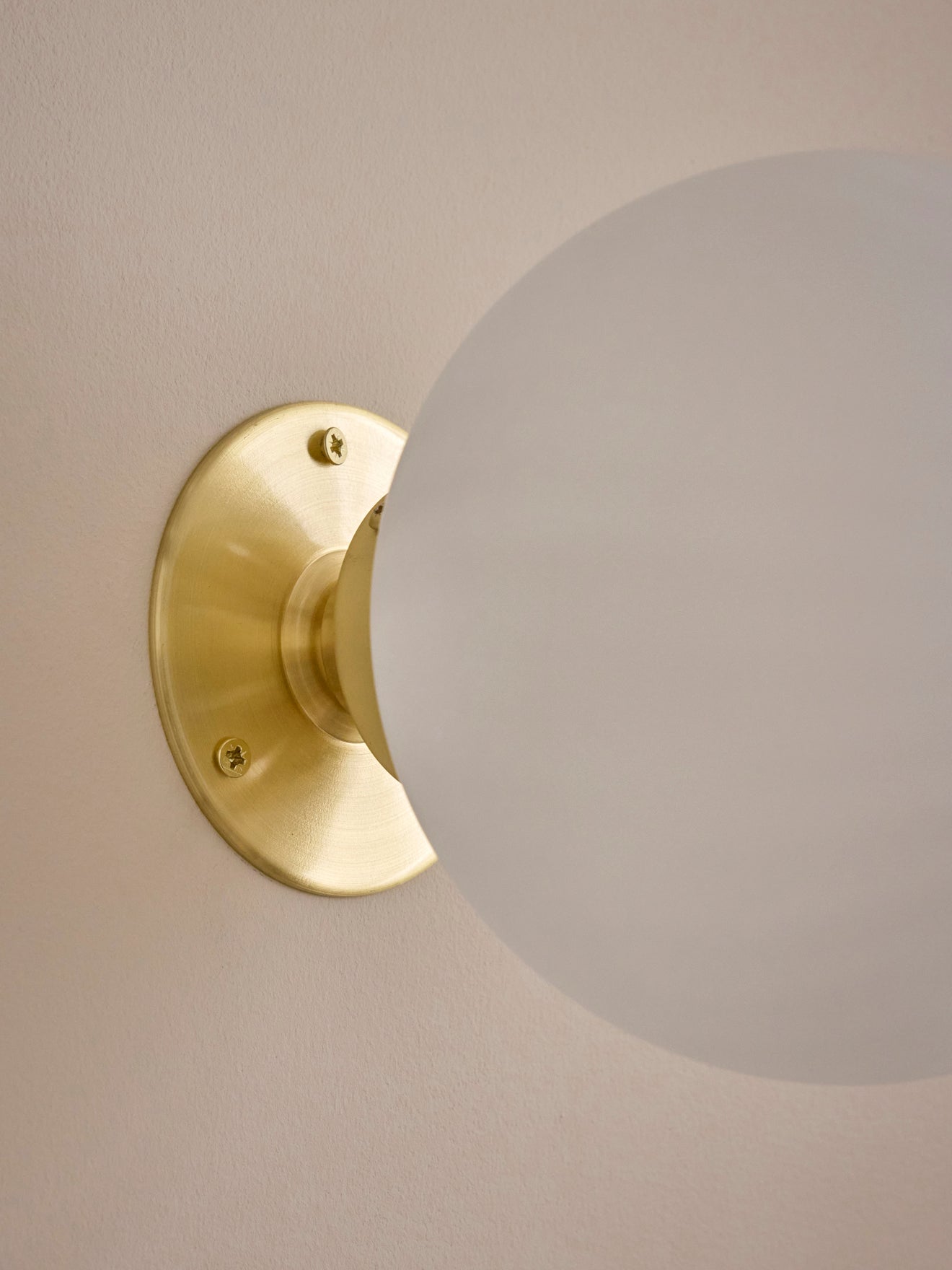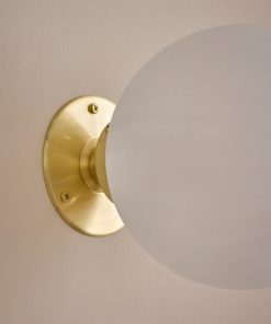 The Doria wall sconce is a true gem on the wall. Inspired by vintage lamps. Sphere in slightly ridged frosted glass. Thin brass base with antique finish. Round wall light made in Portugal.