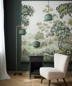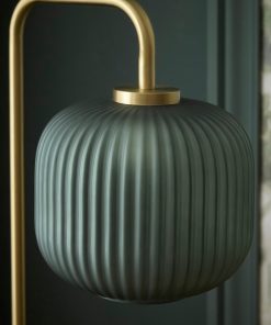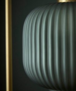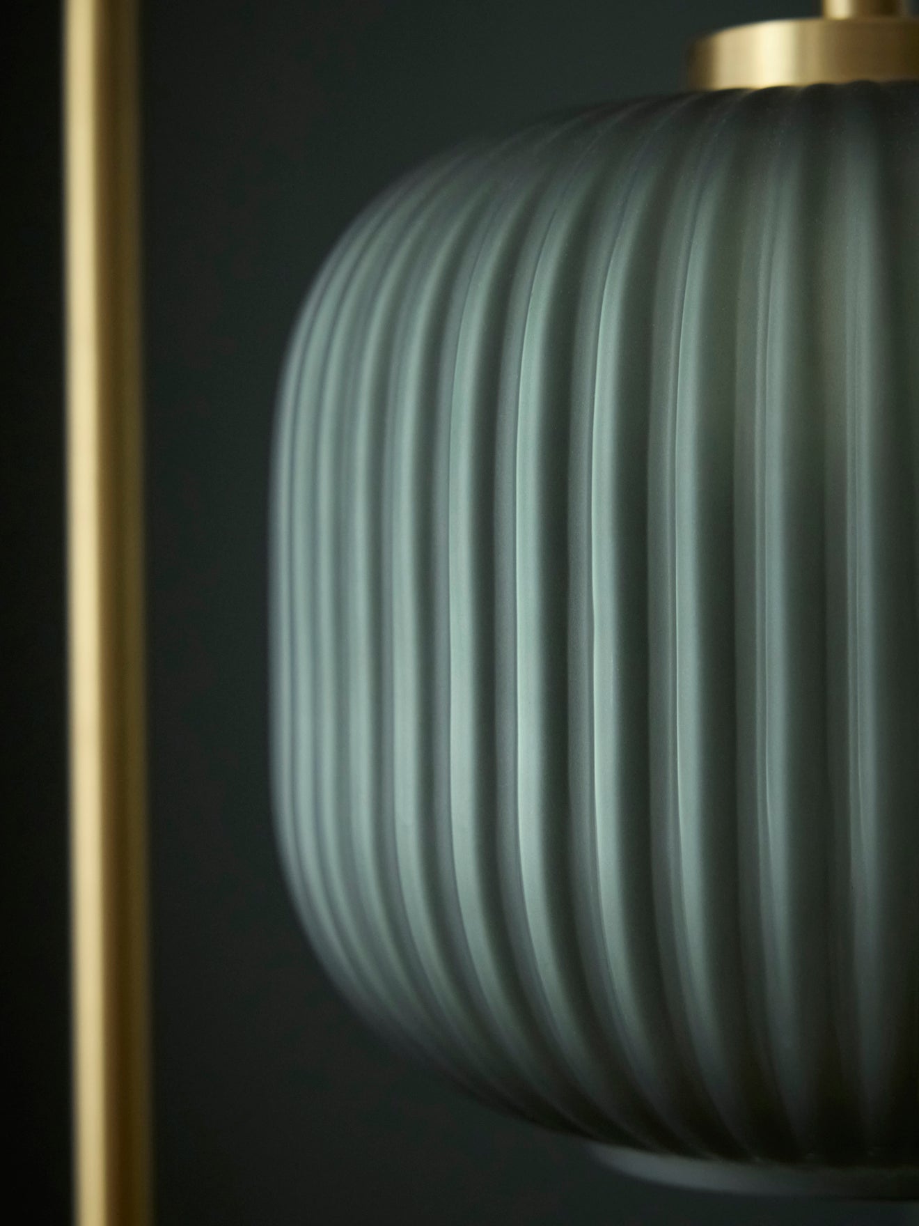 Arsene floor lamp with a sculptural, art deco look. Elegant combination of semi-opaque ribbed glass and golden metal. Available in green and white.