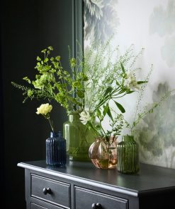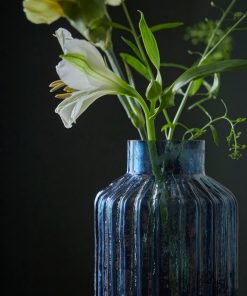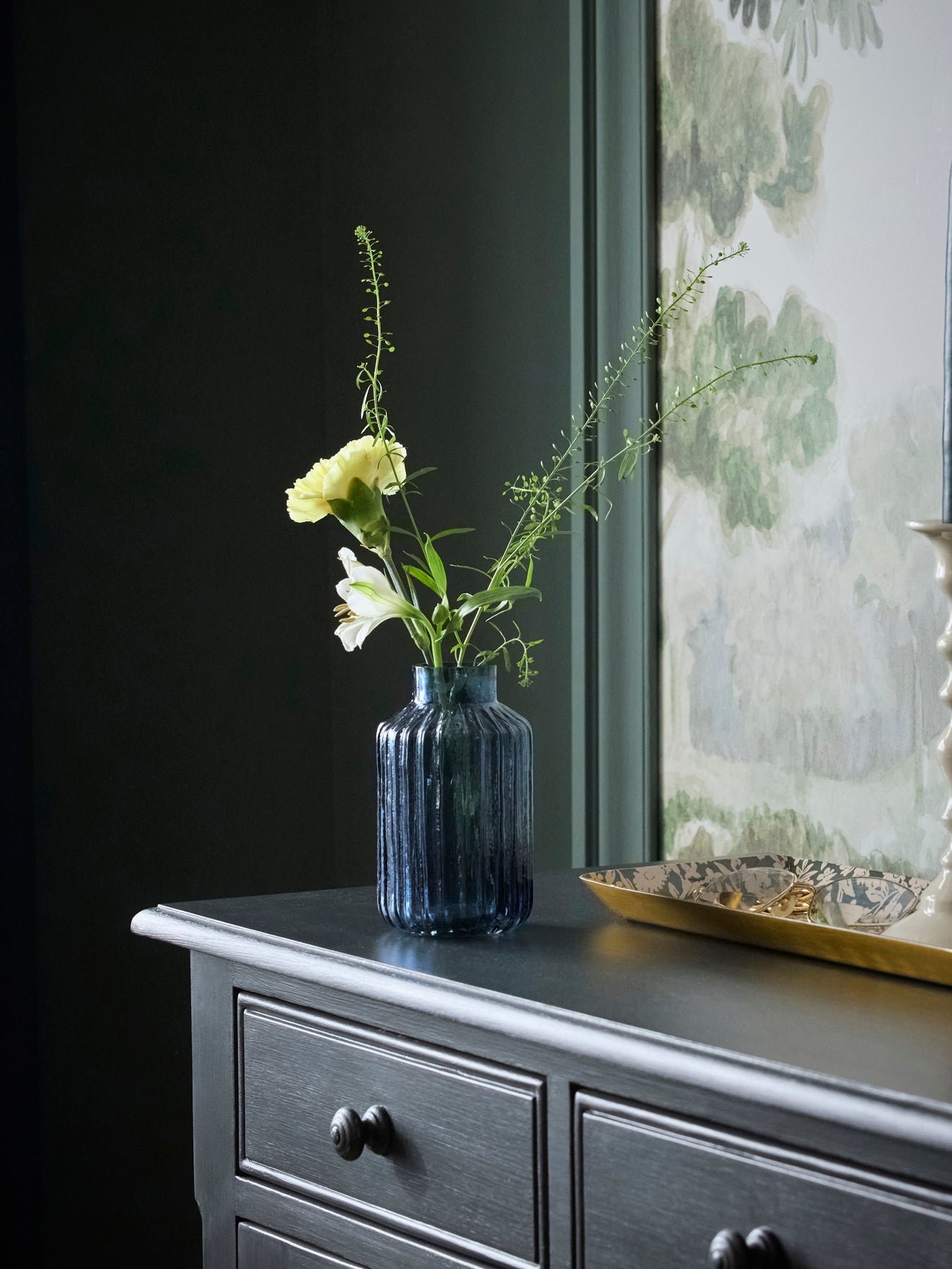 Small vase or single stem vase in ribbed glass available in green or blue. To be placed alone here and there or to be accompanied by our Mathilde and Laura vases.
