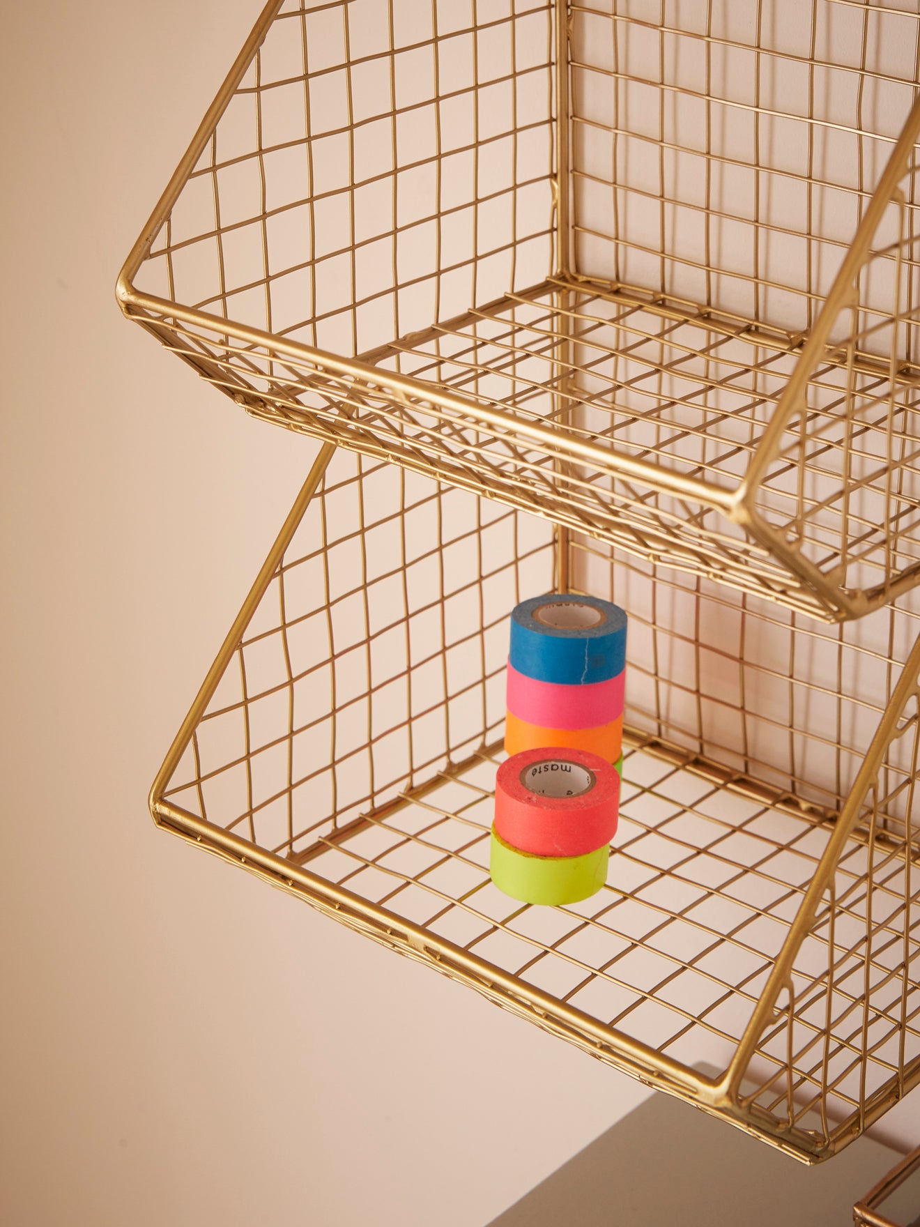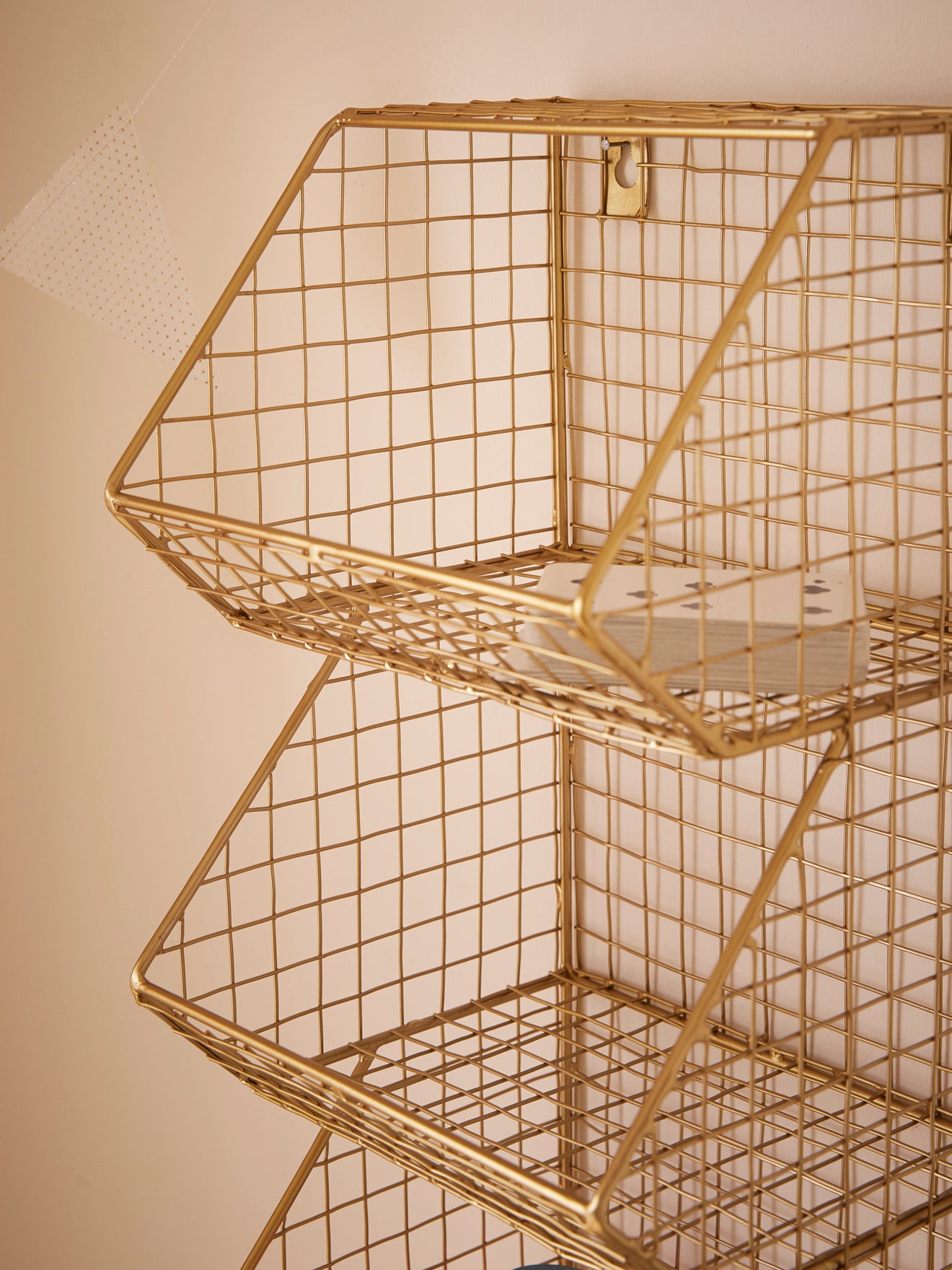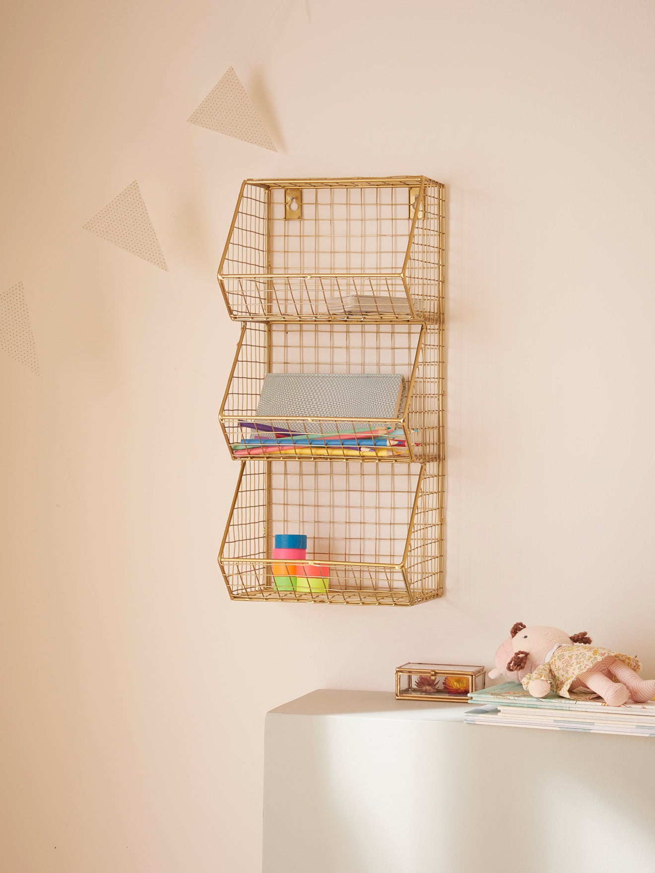 Metal wire shelves made of 3 pigeonhole compartments. Industrial-inspired and decorative storage.
