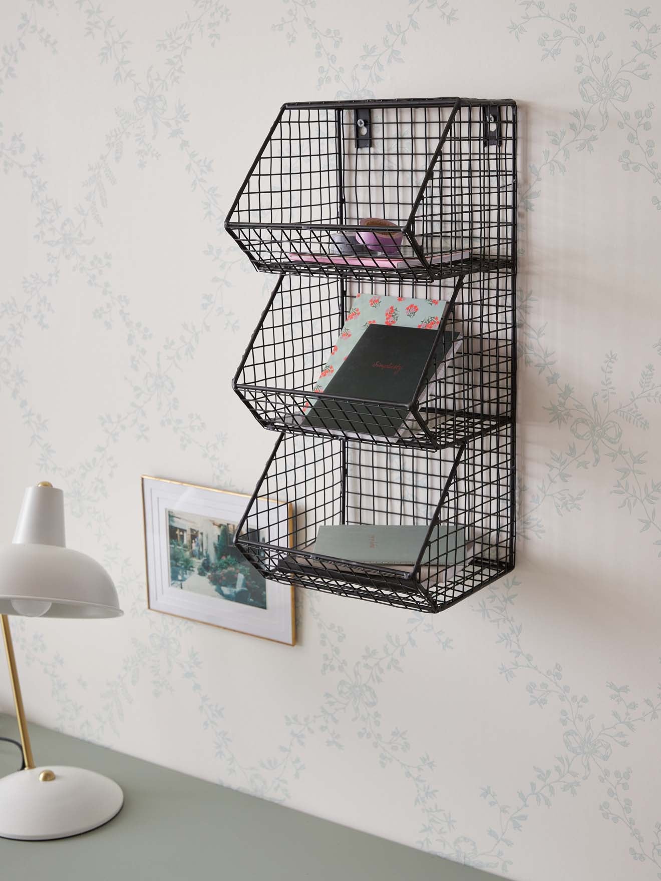 Metal wire shelves made of 3 pigeonhole compartments. Industrial-inspired and decorative storage.