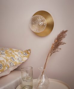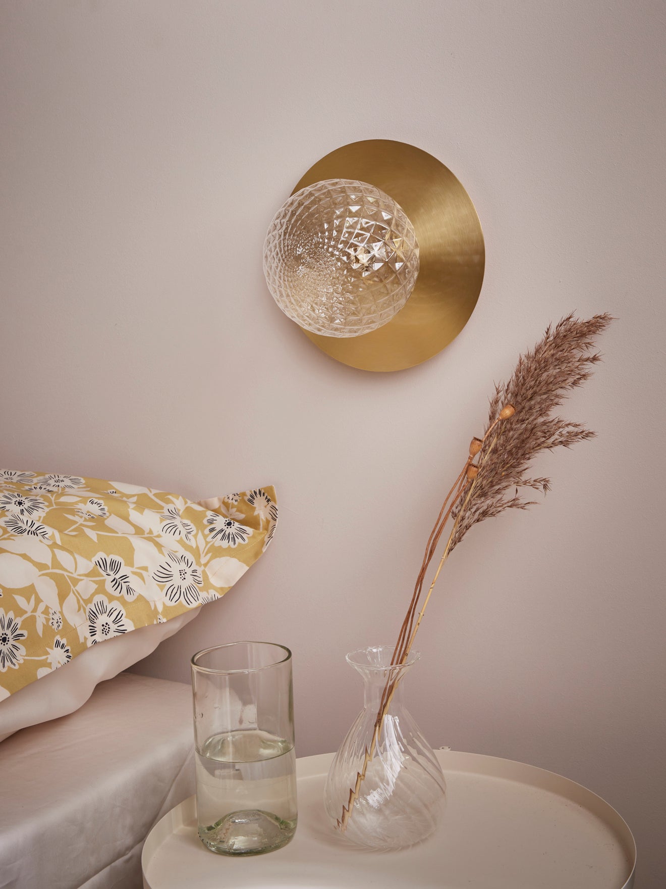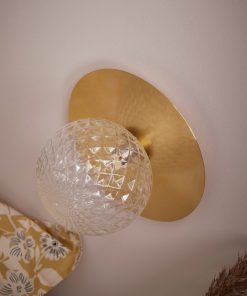 Wall lamp composed of a gilt metal disk and a transparent, chiseled glass sphere. A clever way of dressing up a wall and stylishly lighting up a room.