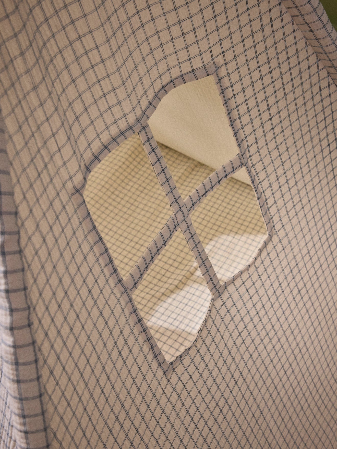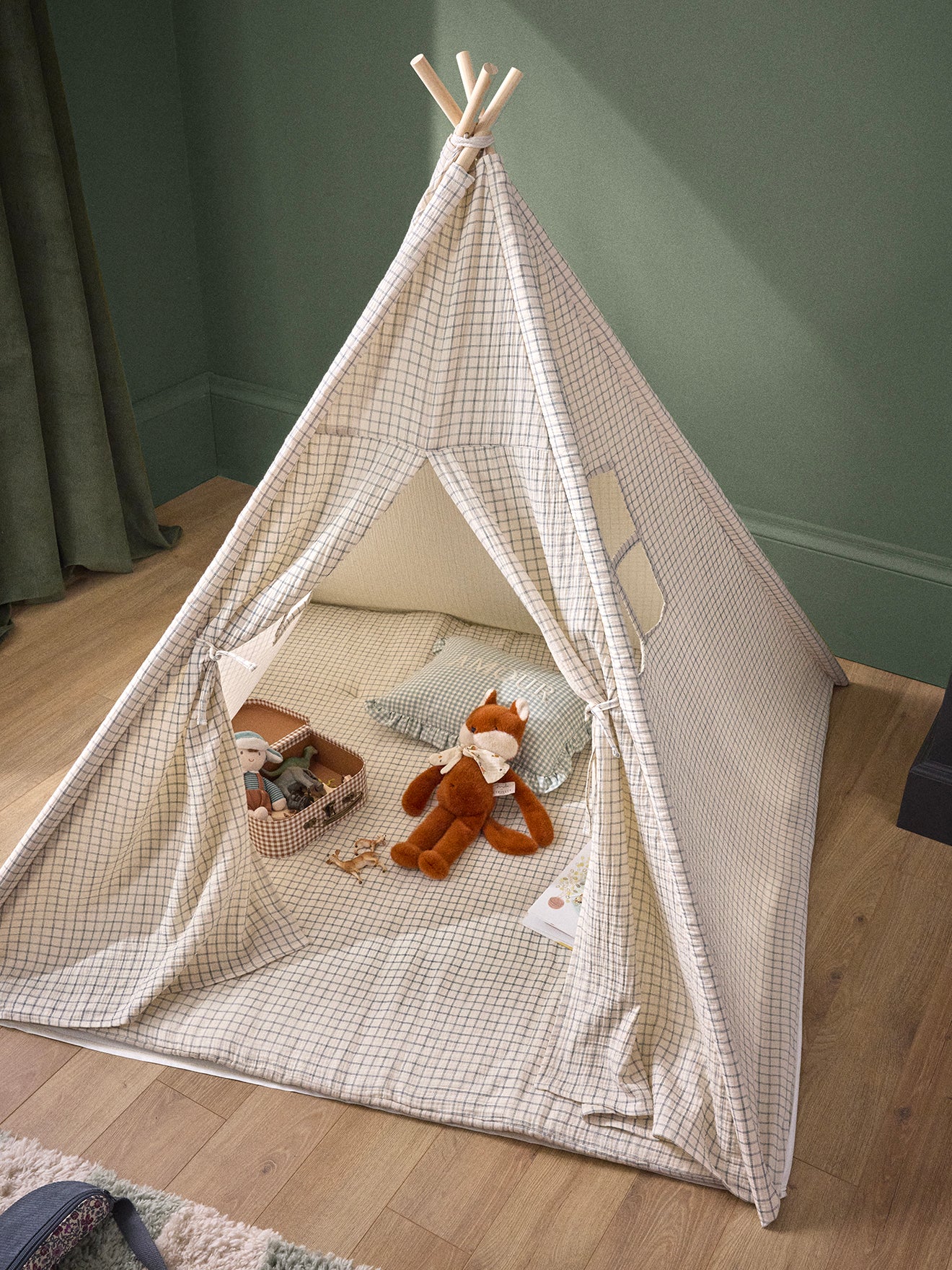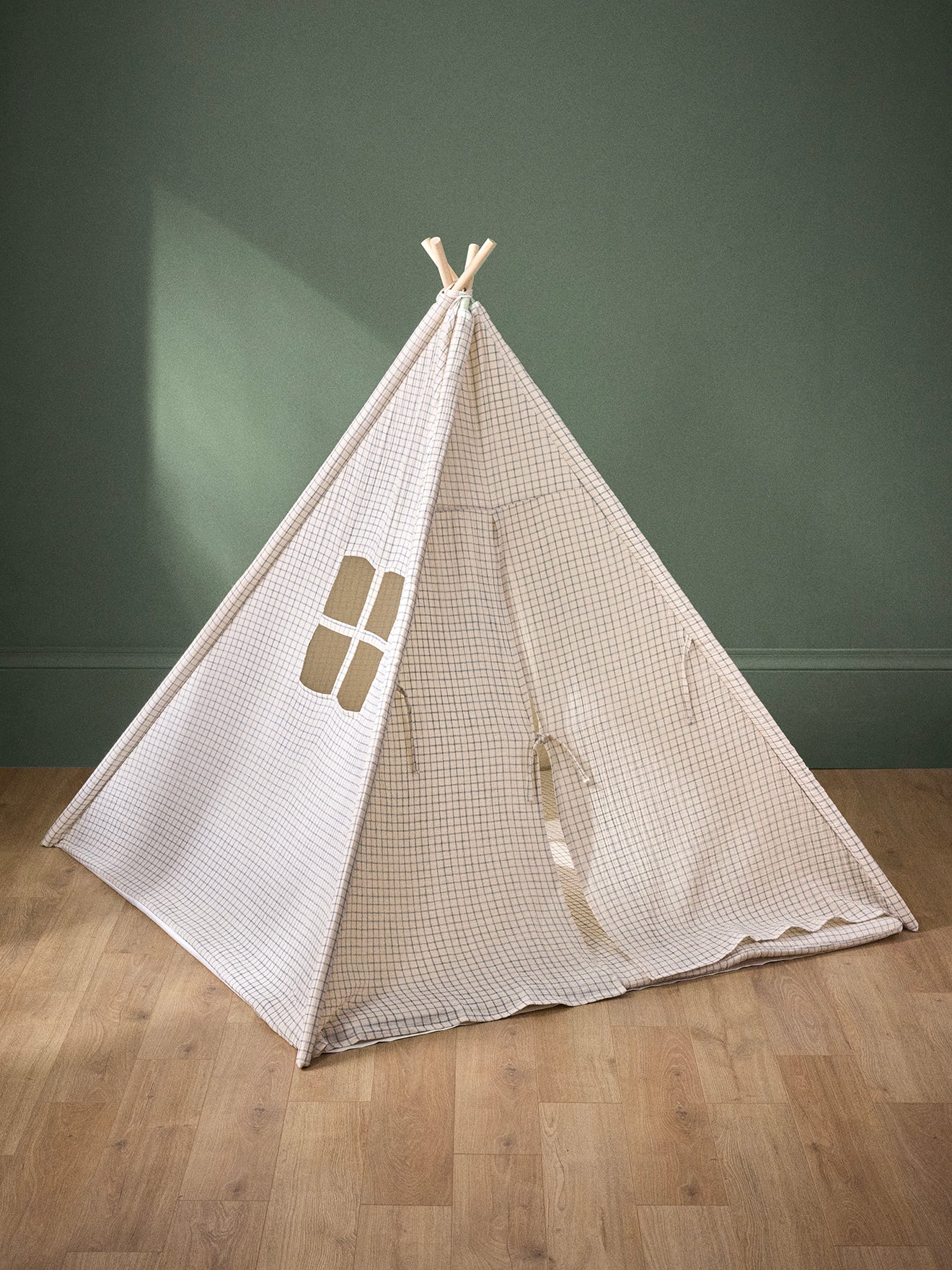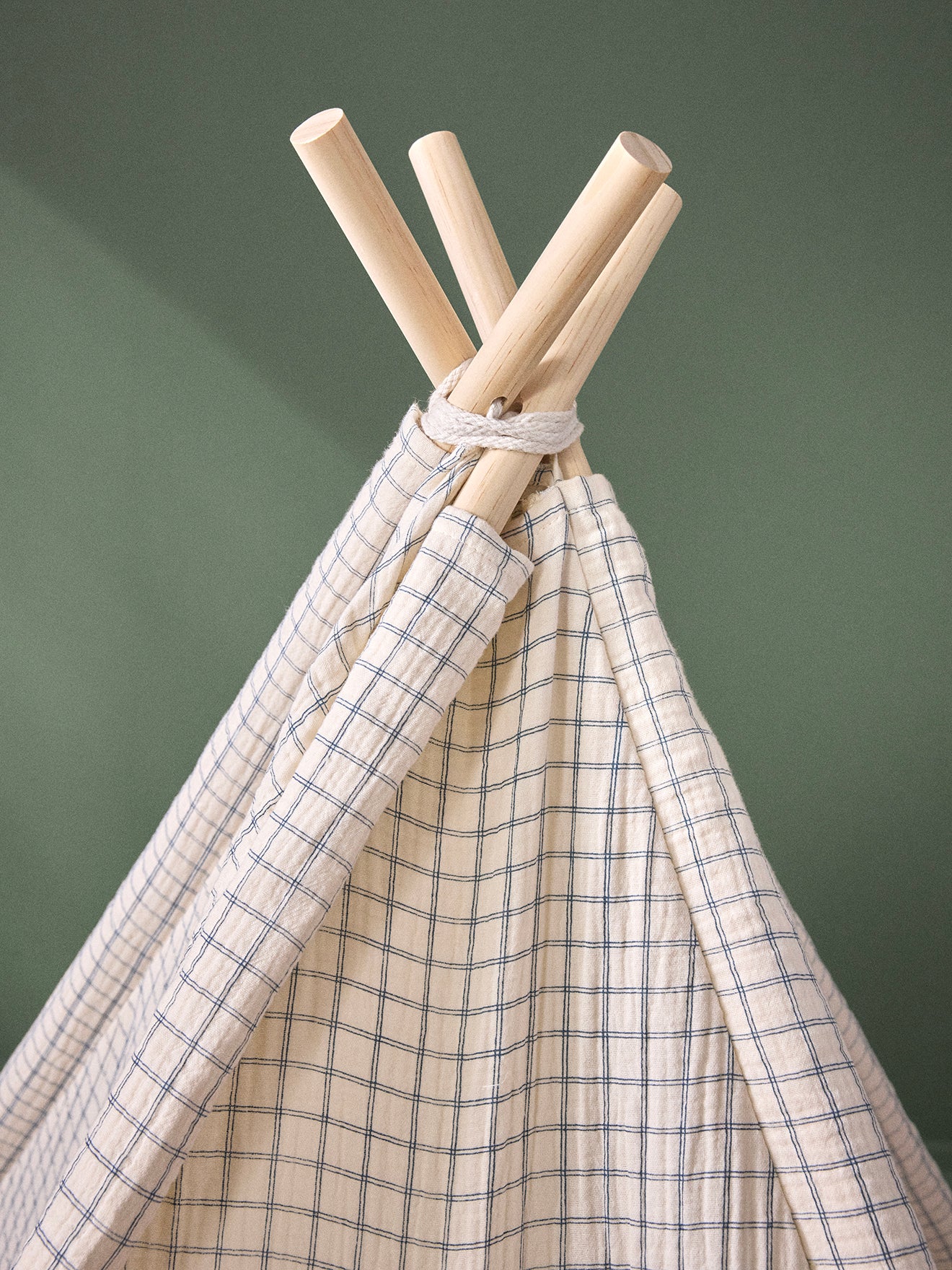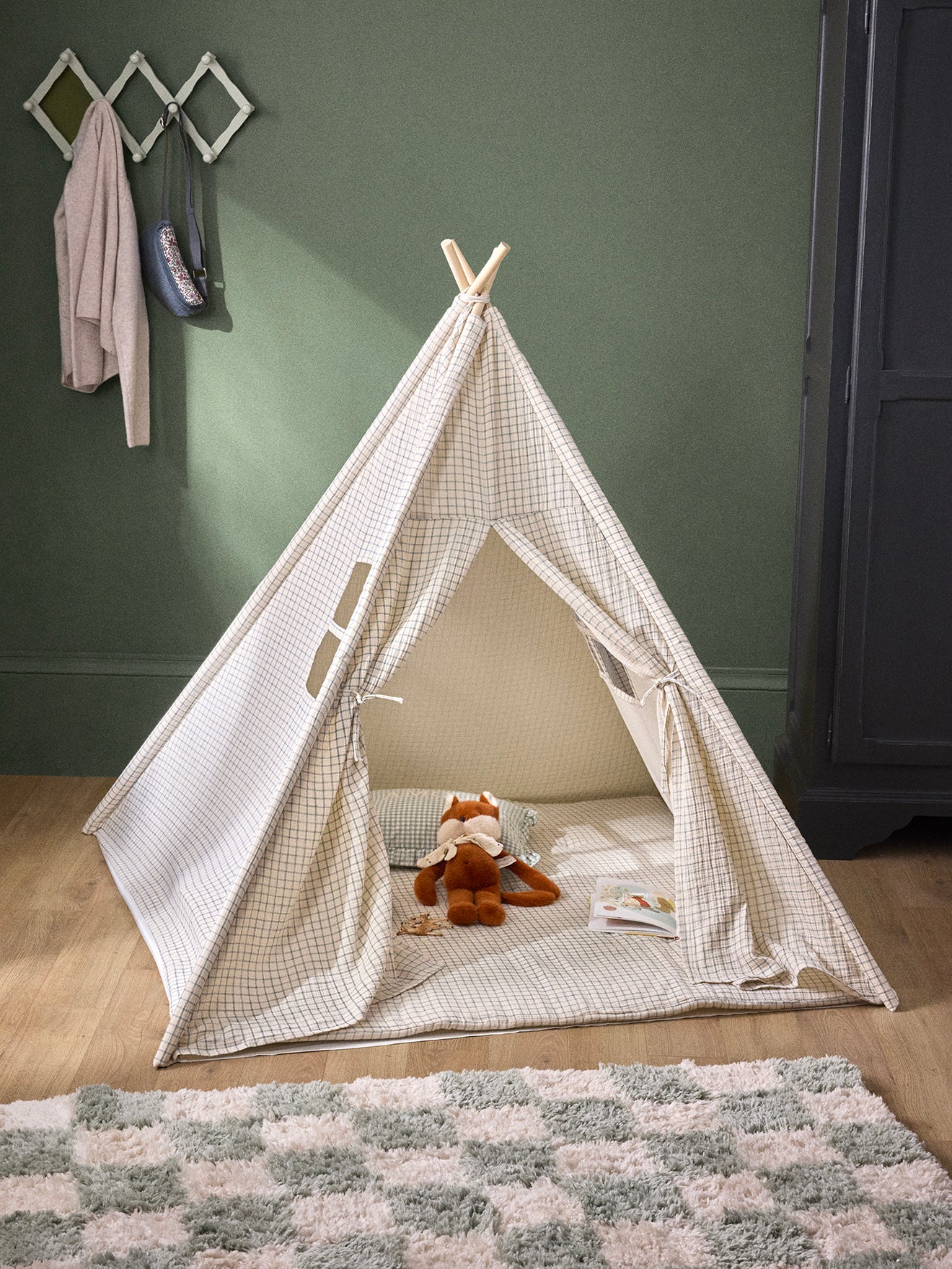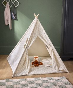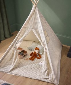 Child’s tent designed in a cottage style, made with 4 wooden stakes and a cotton gauze print fabric. A cozy little nest for playing or relaxing comfortably thanks to the included soft mattress.