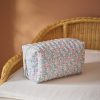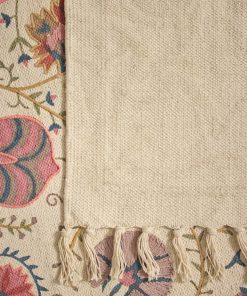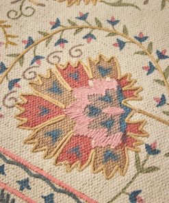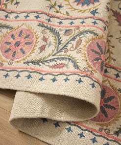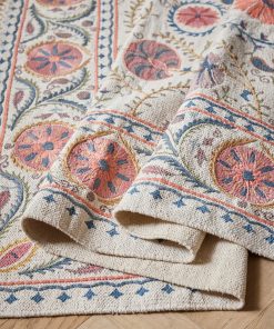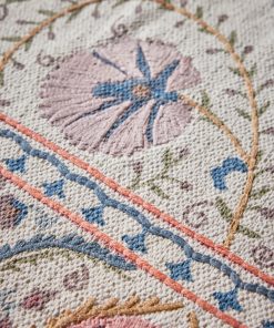 This lightweight cotton rug combines print motifs and embroidered details. An original and authentic rug produced artisanally in India.