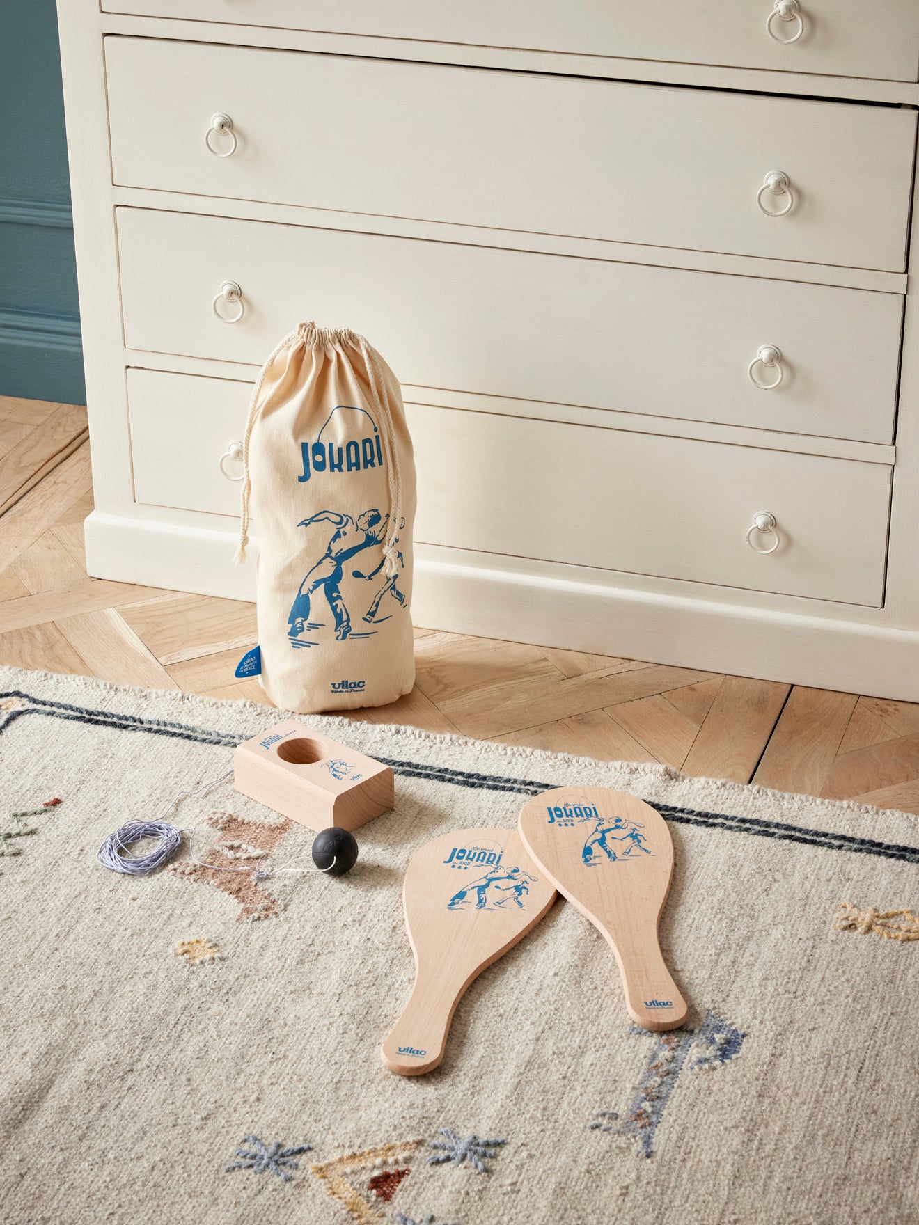 Created and manufactured in France, the jokari is a racket game that can be played alone or with 2 players. It consists of 2 rackets and a rubber ball connected to a base by an elastic. It is delivered in a pouch made of pure cotton. This game promotes dexterity and offers a fun physical activity.