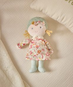 Adorable petite poupée de chiffon en tissu et velours. La robe et le noeud sont confectionnés avec notre imprimé fleuri Mireille. Moelleuse, la poupée Juliette est facile à attraper, à câliner.