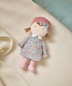 Adorable petite poupée de chiffon en tissu et velours. La robe et le noeud sont confectionnés en authentique tissu Liberty. Moelleuse, la poupée Louison est facile à attraper, à câliner.