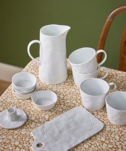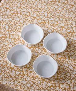 Set of 4 small bowls in ceramic biscuit. Biscuit is unglazed porcelain which gives it a matte aspect. The inside is glazed to protect the ceramic from discoloration. Grooved, irregularly rounded dishes with a message on the bottom: Amour, Bonheur, Joie and Chance*. Ideal for aperitifs, desserts or tea-time.