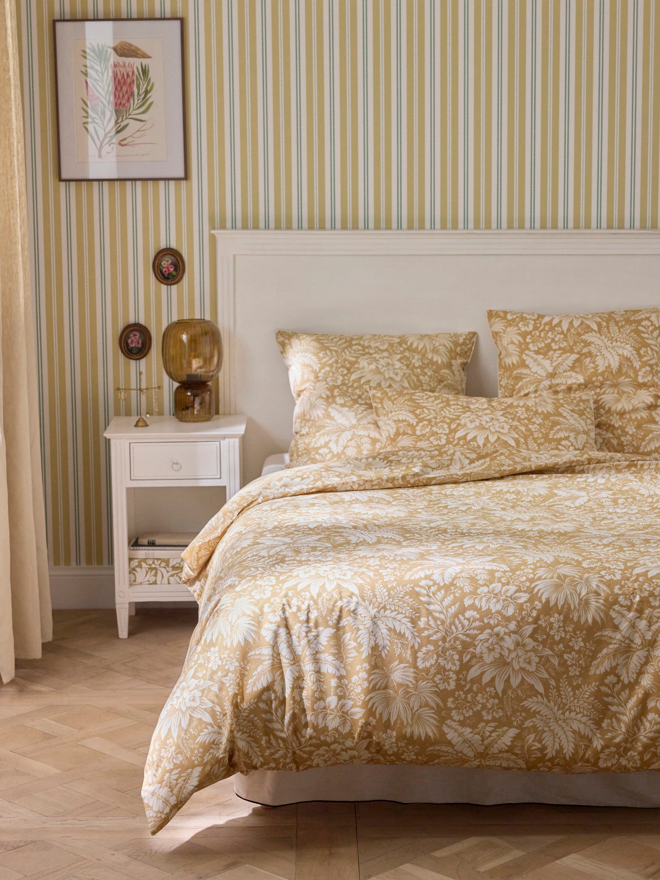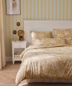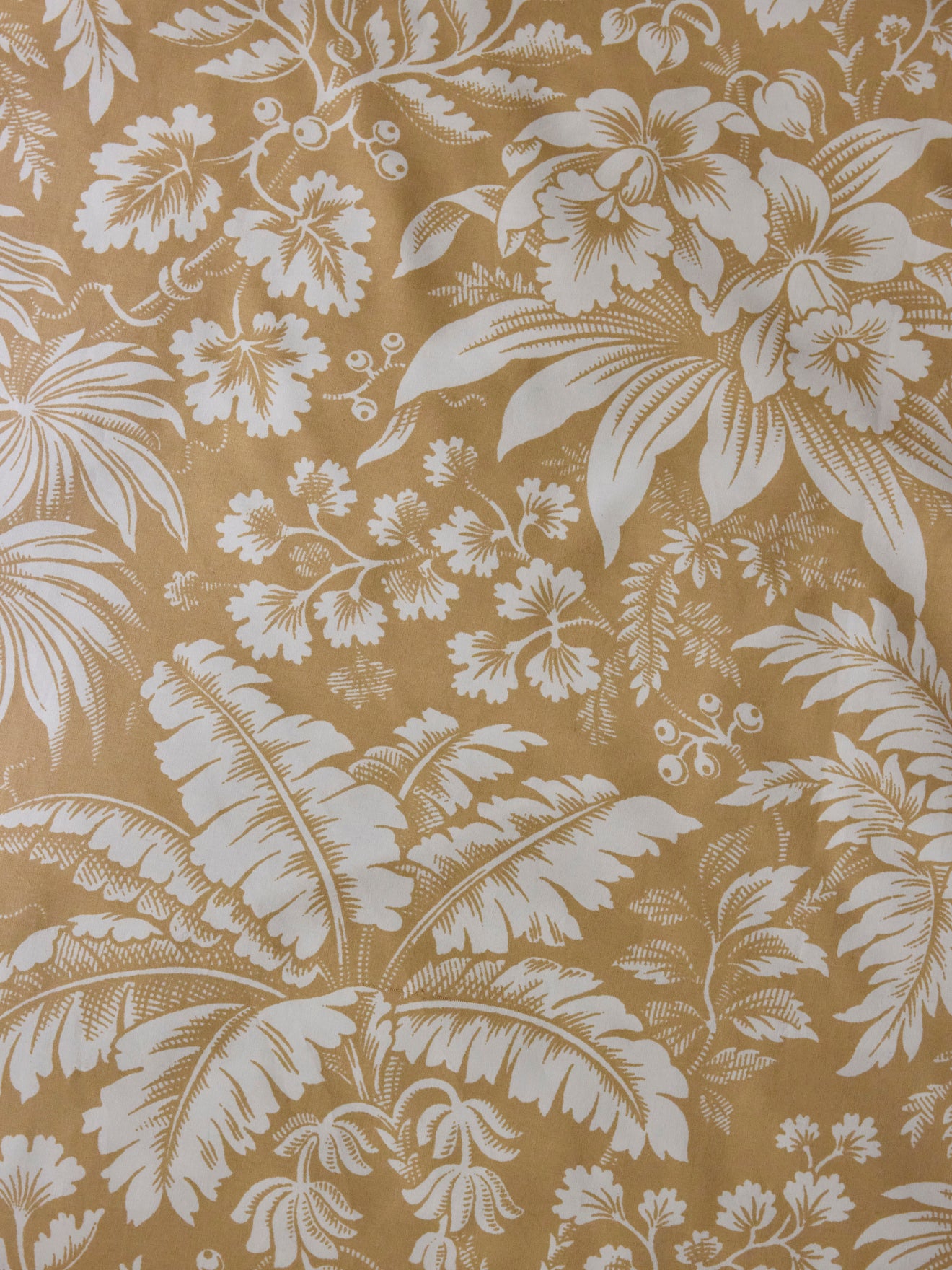 Ivory color leafy motif on a warm beige background. An ornamental and lush print. An exclusive by our style bureau. Pillowcase with print front and back and ivory piping trim.