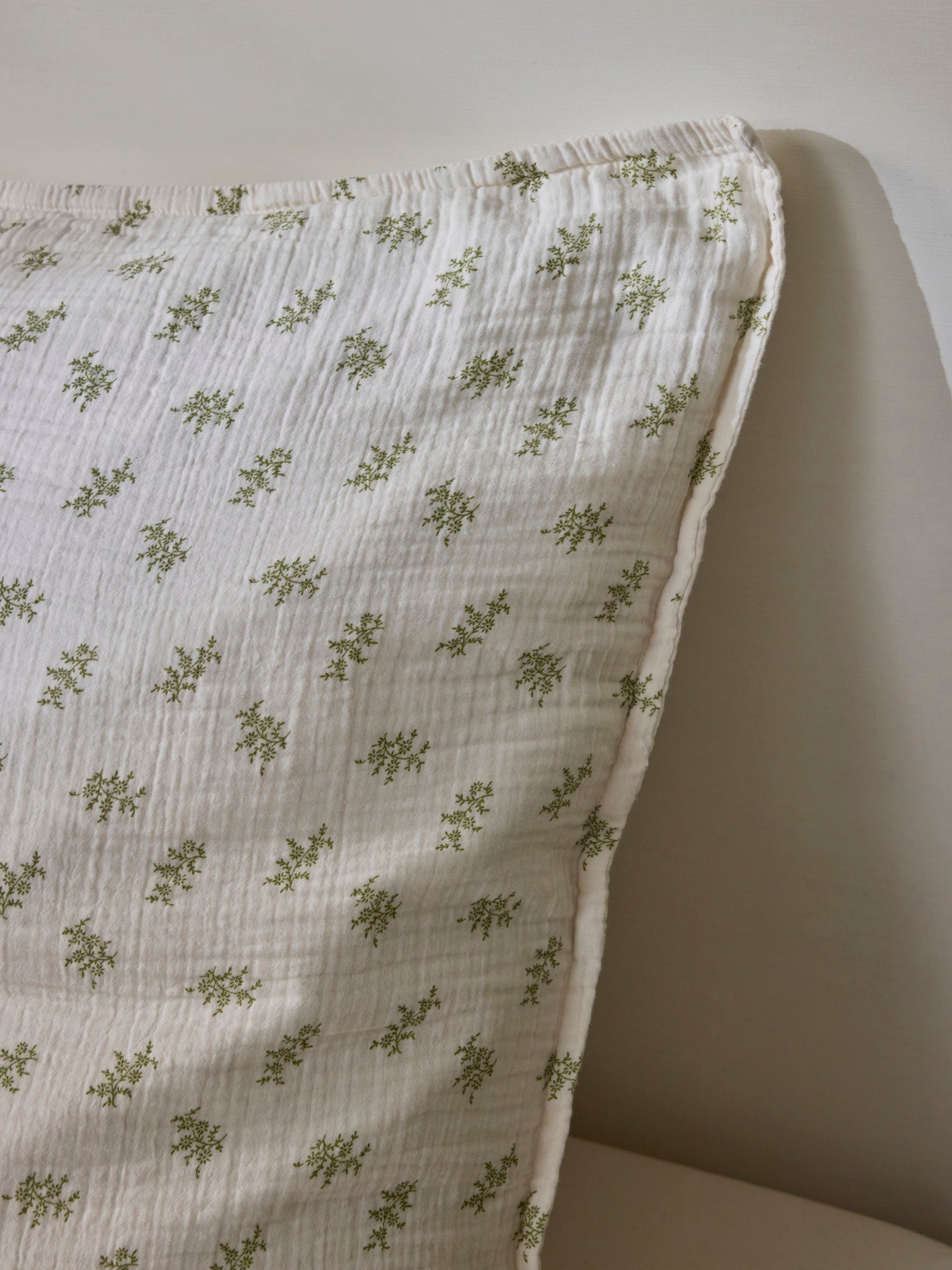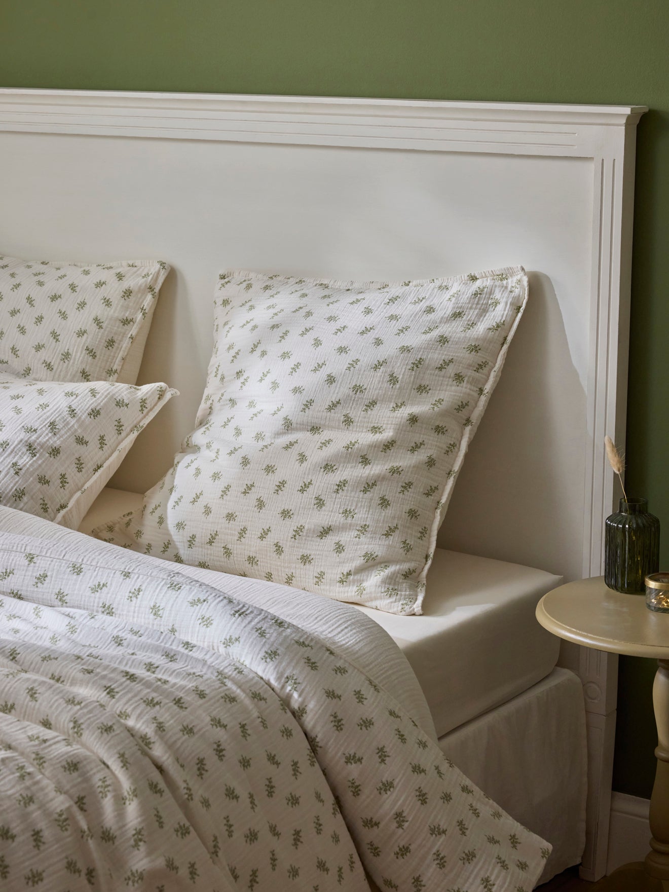 A cotton gauze pillowcase covered with small green boughs. An exclusive and delicate motif designed by our style bureau. Gauze’s slightly crinkled look delivers a soft and breezy comfort.