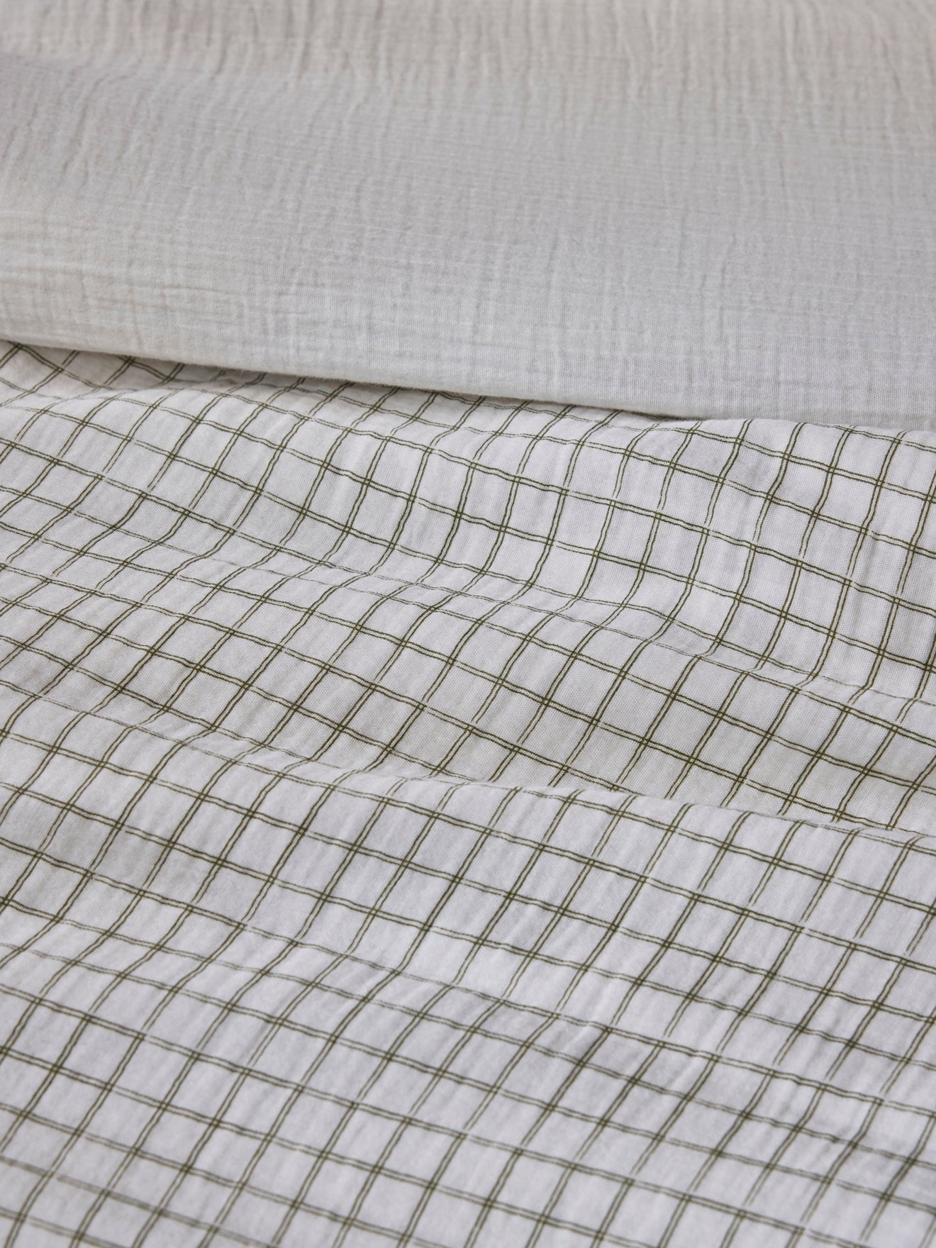 Soft cotton gauze duvet cover that’s light and comfortable. The narrow lines create a double grid pattern that’s timelessly chic