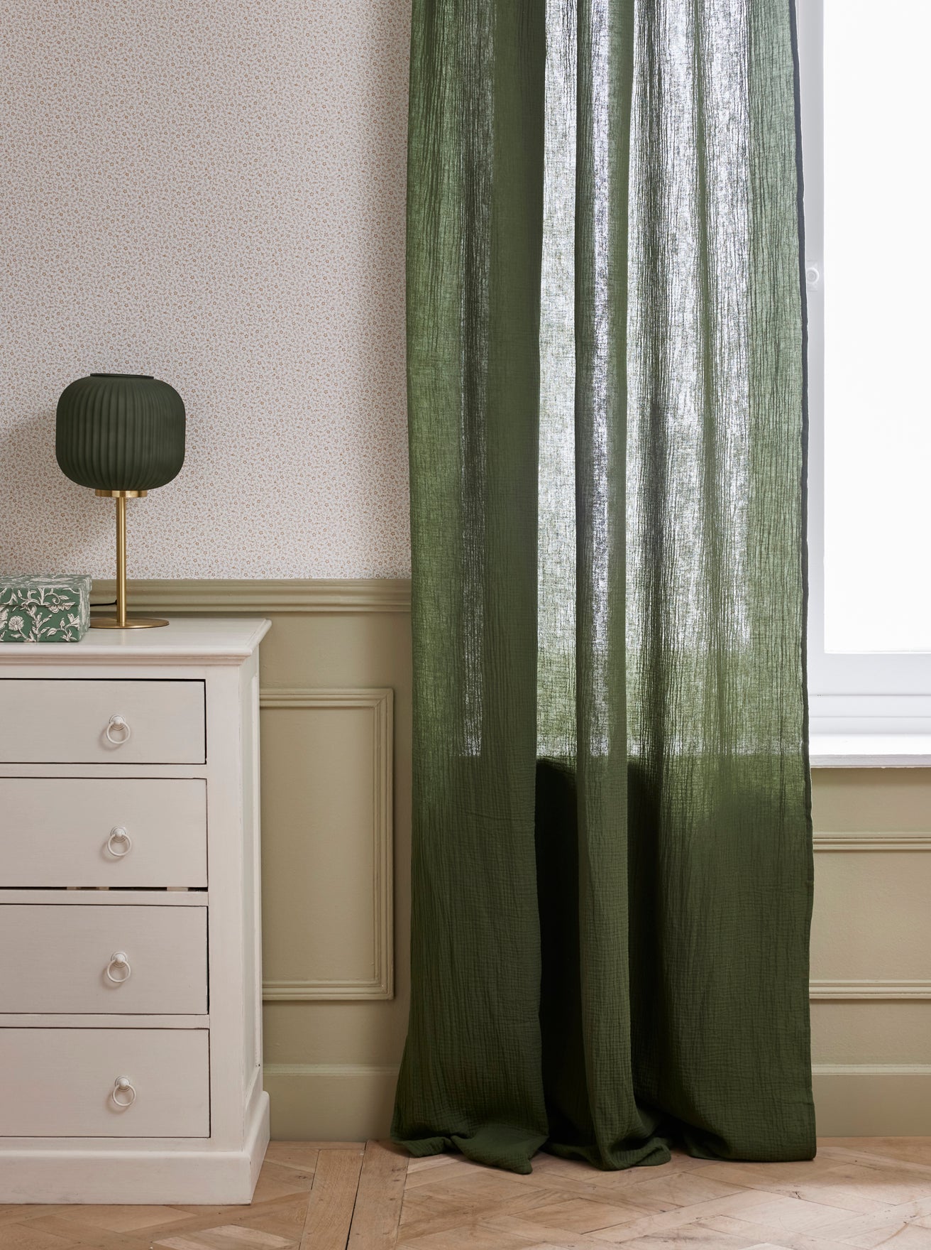 Curtain made with cotton gauze and held with small ties. A crinkled curtain with deliccate refinement.