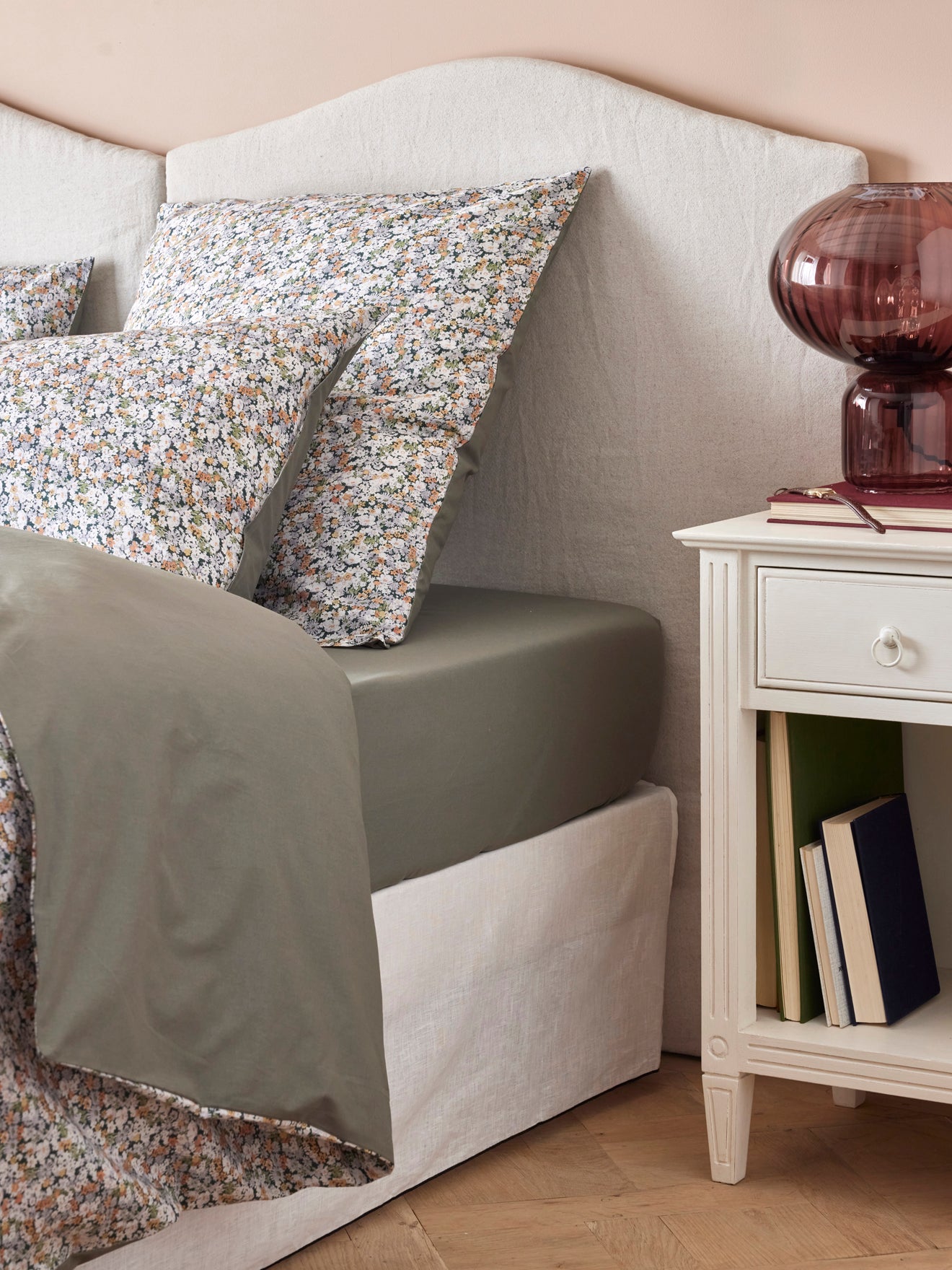 Plain cotton percale (80threads/cm2) fitted sheet made in Portugal. The attractive shade matches the Shasta motif duvet cover and pillowcase made with Liberty fabric.