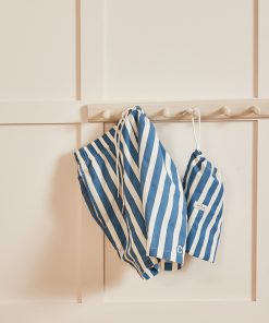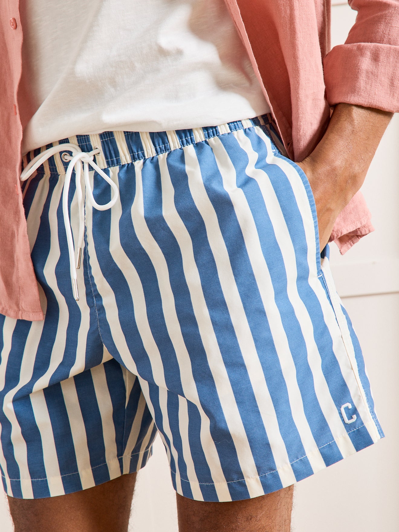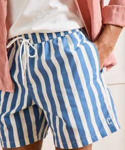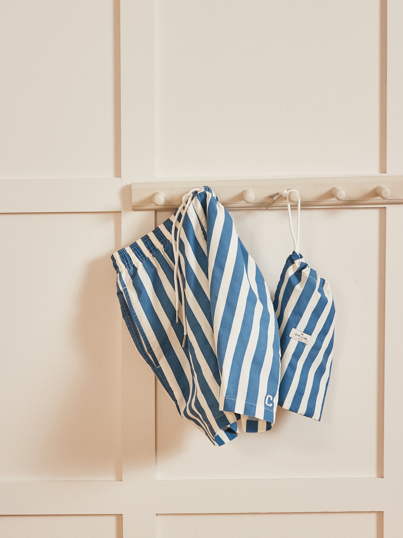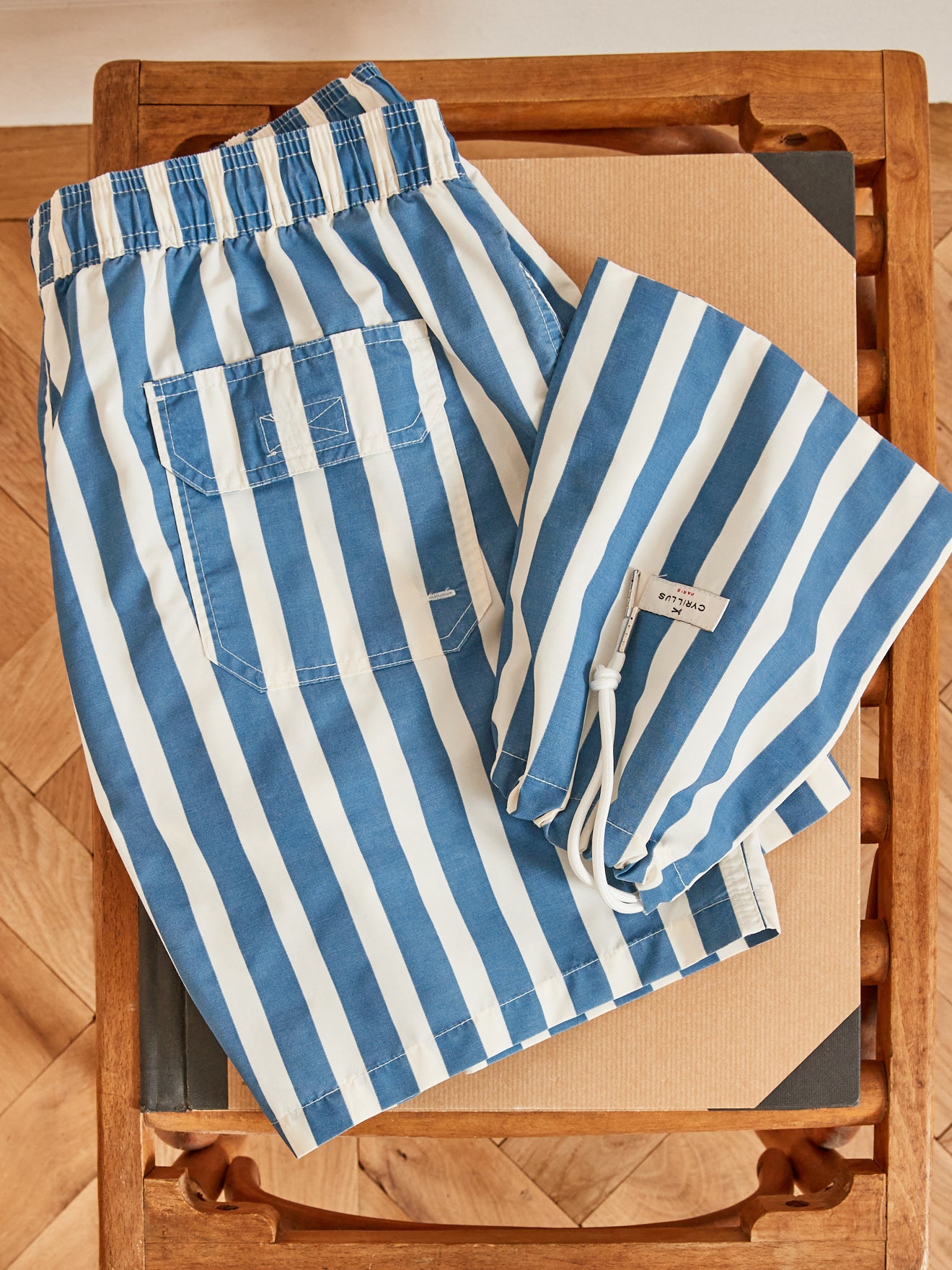 Swim shorts with wide two-color stripes. Fresh and modern style for the beach or pool. And they come in a matching pouch that’s perfect for travel or stowing glasses and other accessories at the beach.