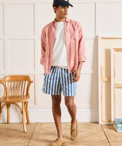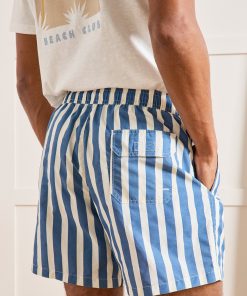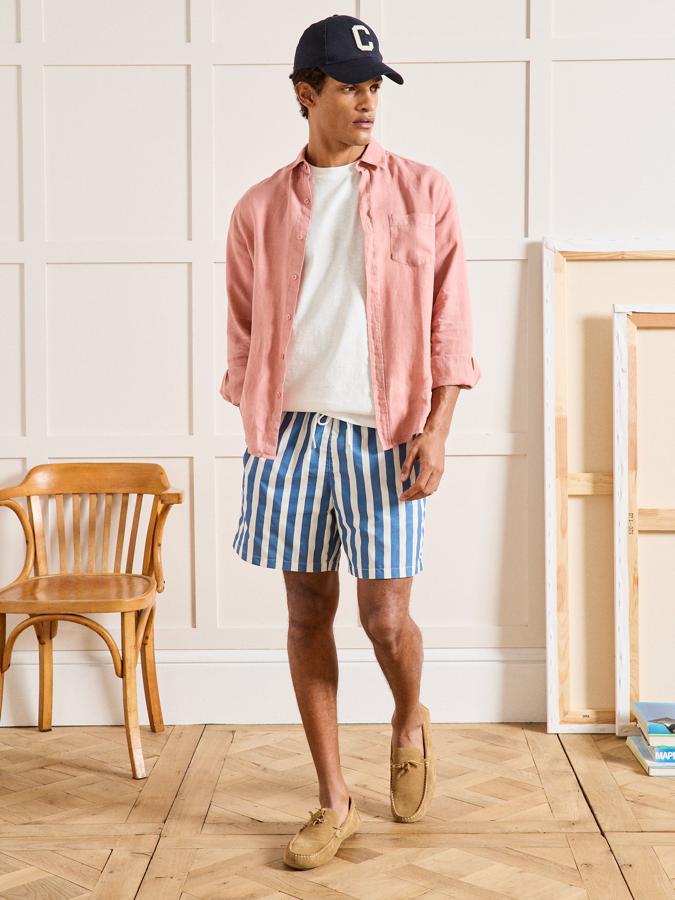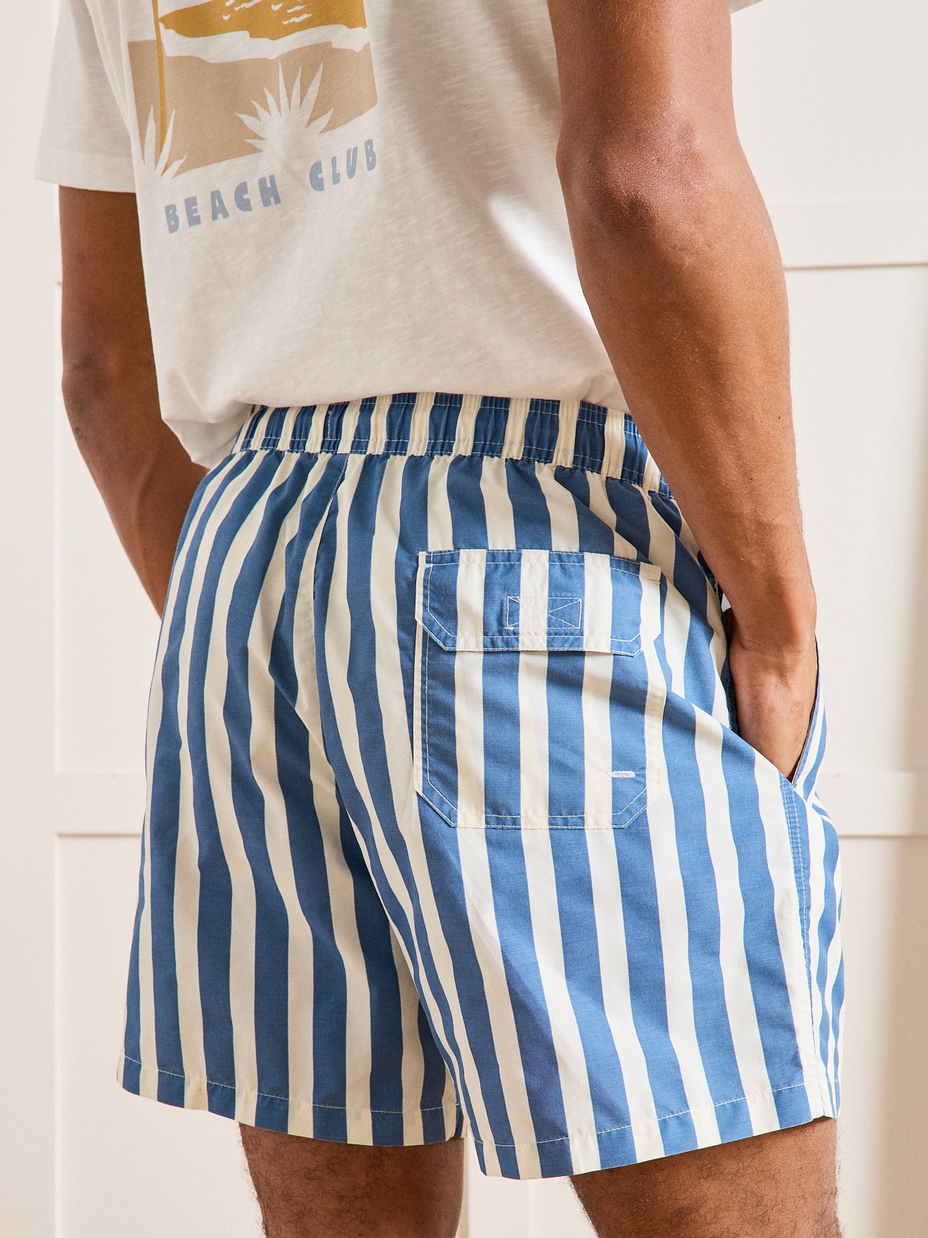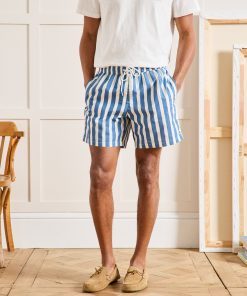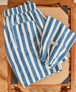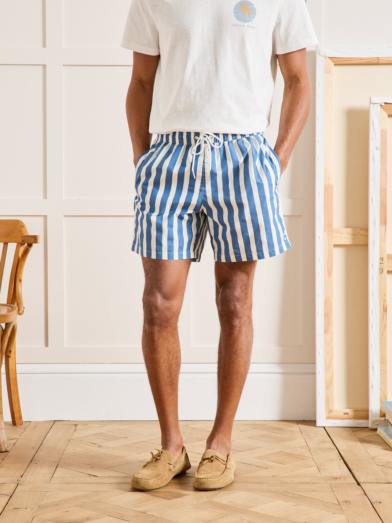 Swim shorts with wide two-color stripes. Fresh and modern style for the beach or pool. And they come in a matching pouch that’s perfect for travel or stowing glasses and other accessories at the beach.