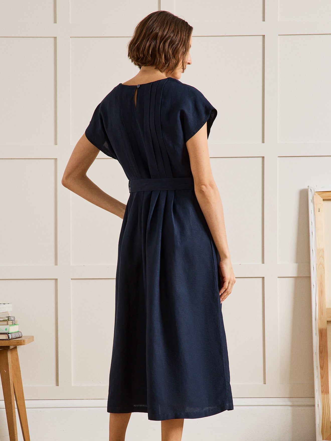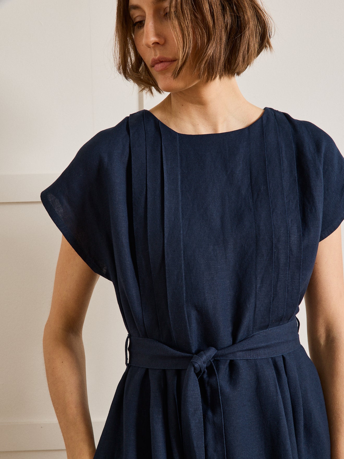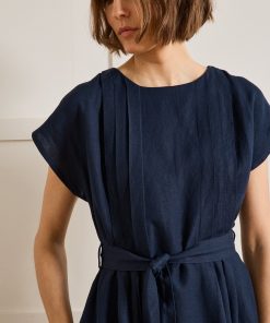 This dress is made in a beautiful blended fabric that looks like linen but with more feminine flow. A T-shape with no arm seams, dropped shoulders with short sleeves and flat pleats front and back for dressy style every day.