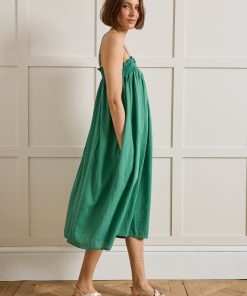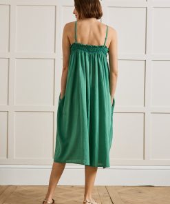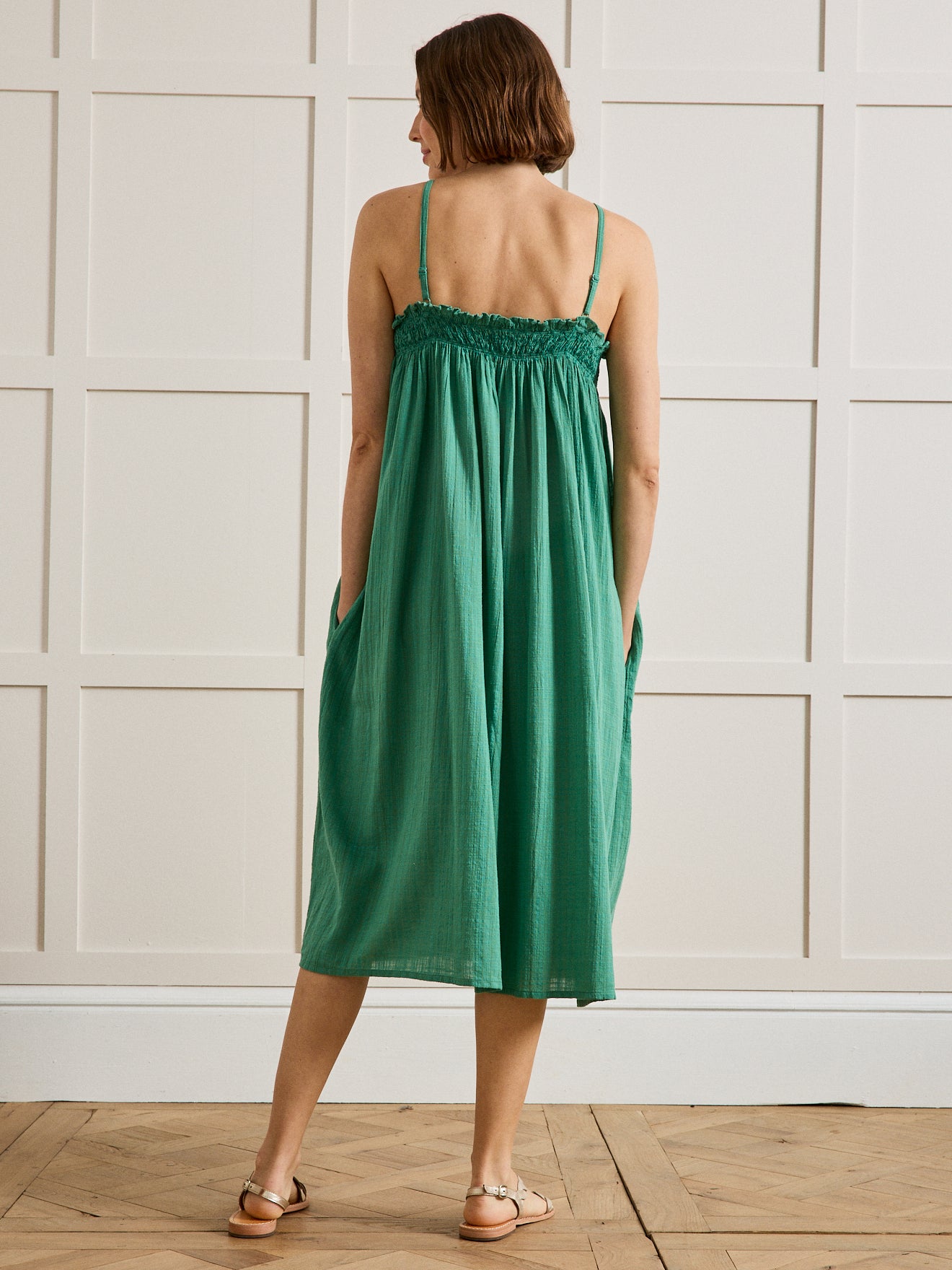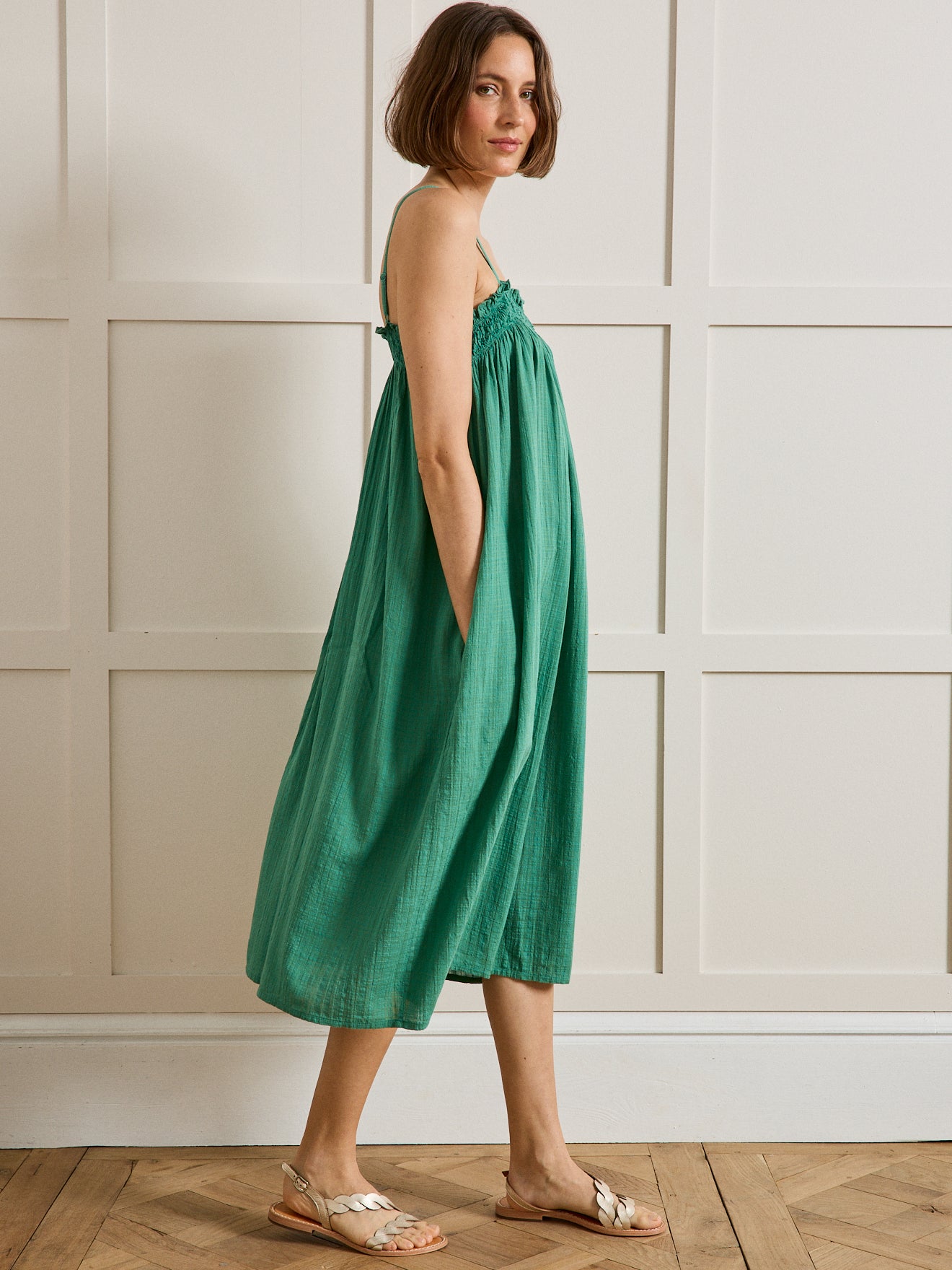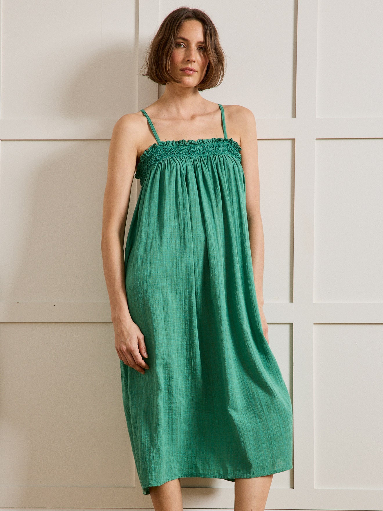 A contemporary color. A slightly textured crepe fabric. Handmade smocks. This is the dress for summer with its light, fresh and feminine style.