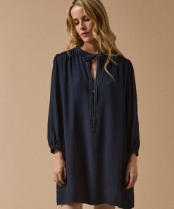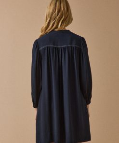 Un crêpe envers satin pour un effet mat/brillant léger. Une ligne un peu housse, un peu loose et discrètement rehaussée de surpiqûres contrastées. Un coloris intemporel facile à porter. L’indispensable robe d’un quotidien moderne, chic et féminin.