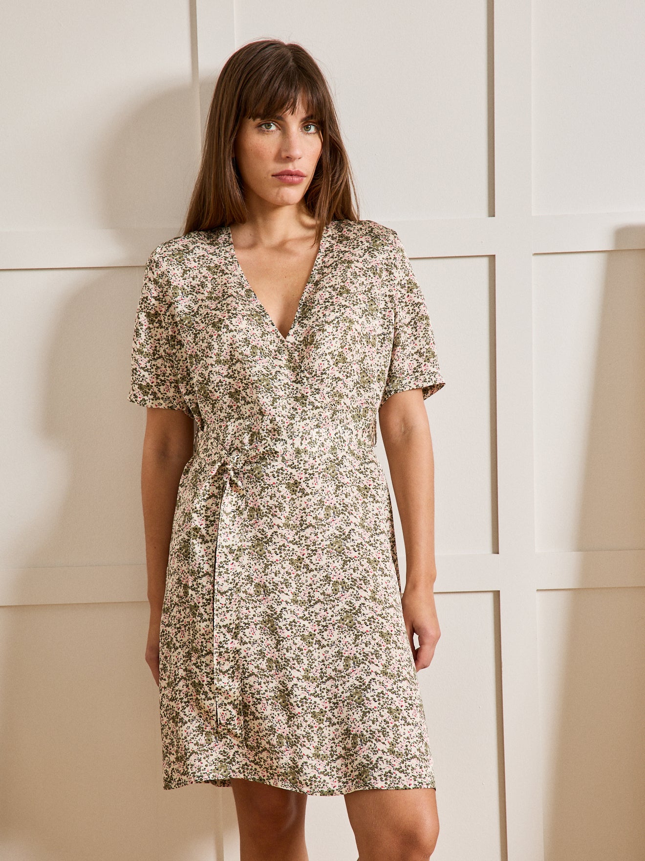 The exclusive print adds bright style with its slightly crinkled, satiny fabric. Easy for every day, this crossover dress elevates the season with bubbly, feminine fashion.