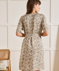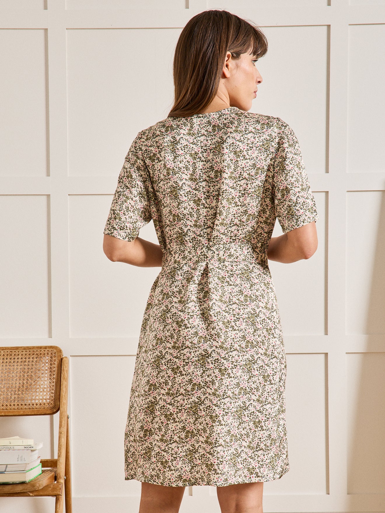 - Slightly flared hem from the waist seam, belt in the same fabric ties at front