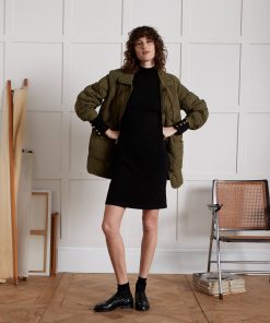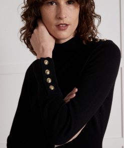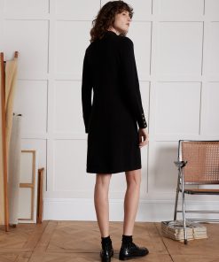 Timeless and easy for every day, this sweater-dress is enhanced in black without losing its appeal thanks to the season’s decorative accent: golden buttons.